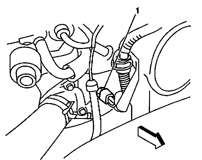 The Engine Coolant Temperature (ECT) sensor (1) is located at the front of the intake manifold, near the thermostat housing. The ECT sensor is a thermistor (a variable resistor that changes value when the temperature changes). The ECT sensor is connected in series with a fixed resistor in the Powertrain Control Module (PCM). The PCM applies 5 volts to the ECT sensor. The PCM monitors the voltage drop across the ECT sensor and converts the voltage reading into a temperature value. The ECT sensor voltage reading at the PCM will vary with the changes in the engine temperature.