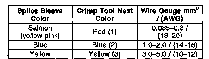 4. Select the proper sealed splice sleeve according to the wire size. Refer to the above table at the beginning of the repair procedure for the color coding of the splice sleeves and the crimp tool nests.