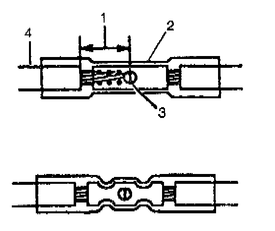 9. Insert the wires into the splice sleeve until the wire hits the barrel stop. The splice sleeve has a stop in the middle of the barrel in order to prevent the wire from passing through the splice (3).