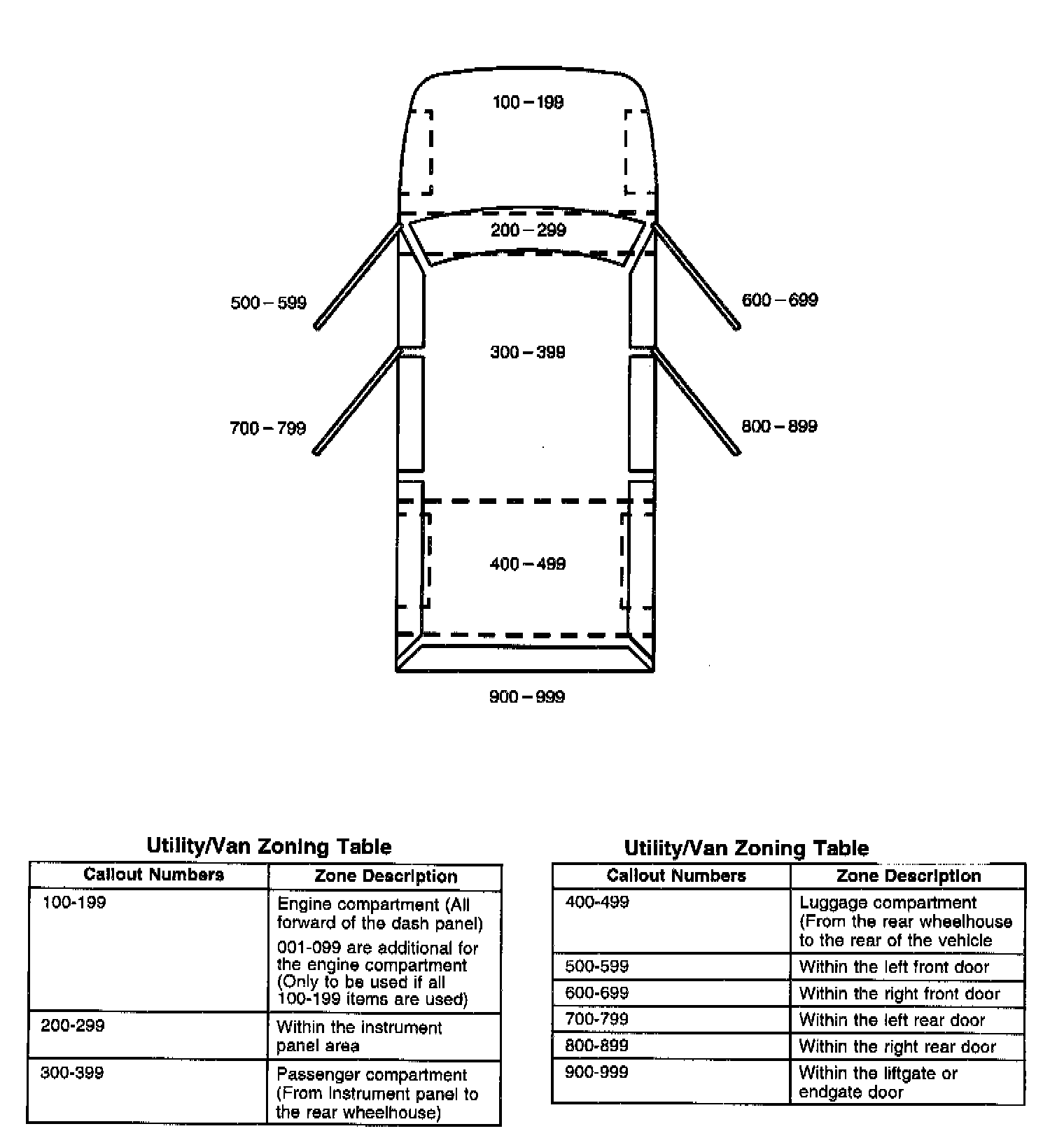 All grounds, in-line connectors, pass-through grommets, and splices have identifying numbers that correspond to where they are located in the vehicle. The following table explains the numbering system.