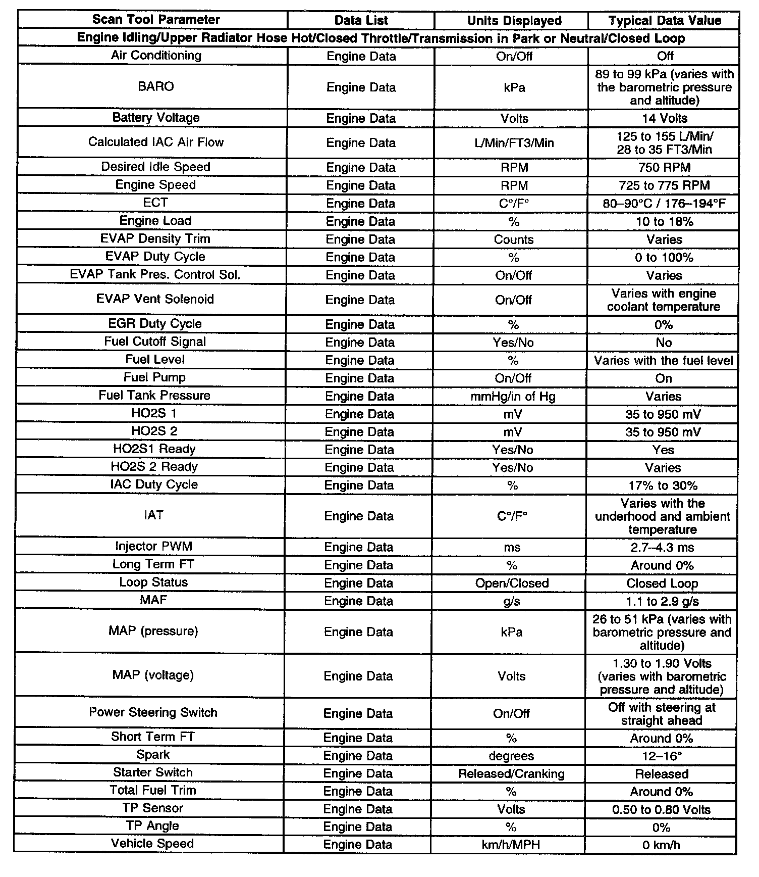 Scan tool values from a properly running engine may be used for comparison with the engine you are diagnosing. The Engine Scan Tool Data List represents values that would be seen on a normal running engine.