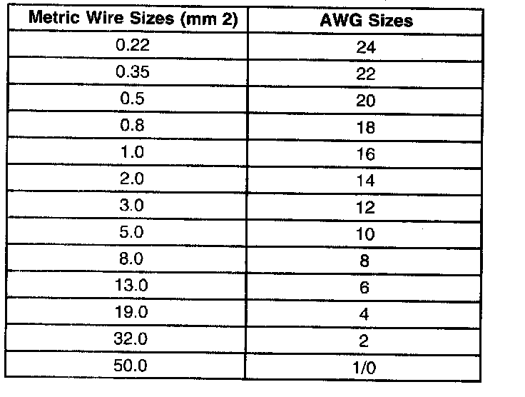 Wire Size Conversion Table: