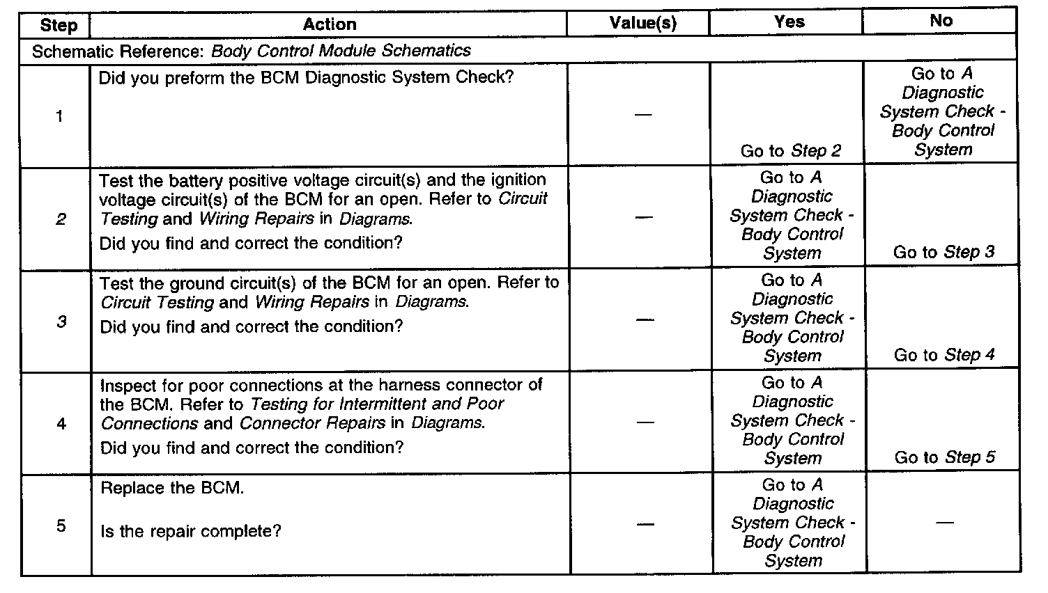 Home >> Chevrolet >> 2000 >> Venture V6-3.4L VIN E >> Repair and Diagnosis >> Powertrain Management >> Computers and Control Systems >> Relays and Modules - Computers and Control Systems >> Body Control Module >> Testing and Inspection >> Symptom Related Diagnostic Procedures