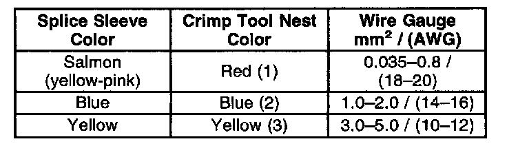 4. Select the proper sealed splice sleeve according to the wire size. Refer to the above table at the beginning of the repair procedure for the color coding of the splice sleeves and the crimp tool nests.