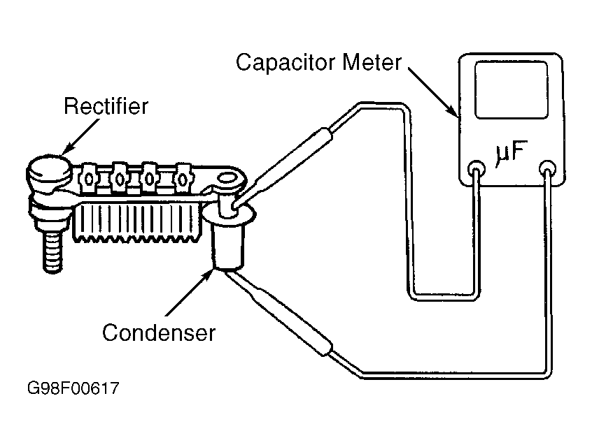Using a digital capacitor meter, measure condenser capacity. See Fig 1 . If capacity is not 0.5 microfarad (mF), replace rectifier.
