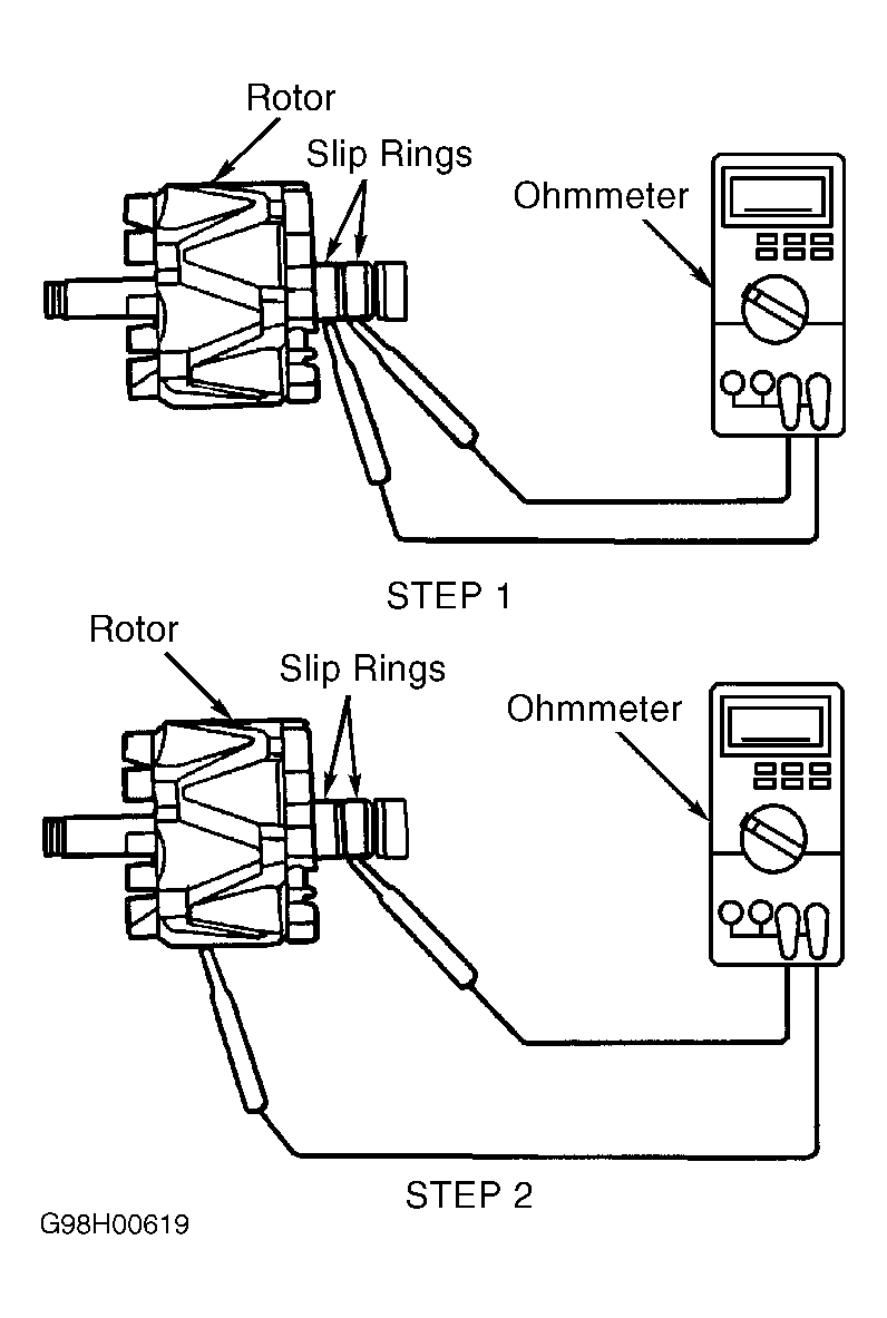 - Using an ohmmeter, measure resistance between rotor and slip rings. Perform STEP 2. See Fig 1