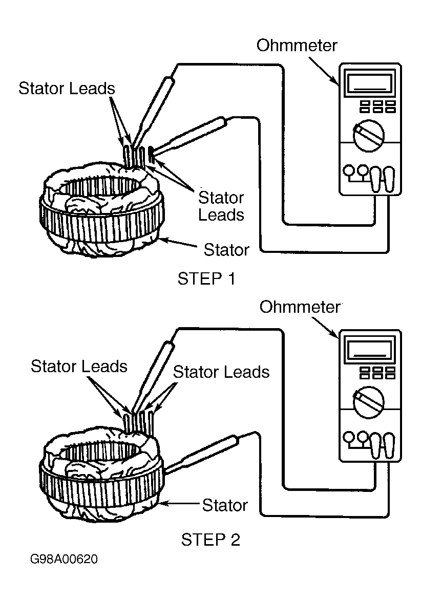 - Using an ohmmeter, measure resistance between stator leads. Perform STEP 1. See Fig 1 . If resistance is more than 5 ohms for any measurement, replace stator.