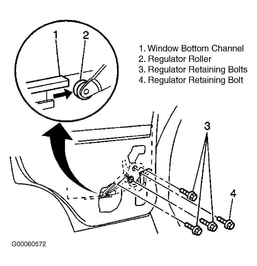 - Slide regulator arm roller (2) into window bottom channel (1). Secure regulator with 4 bolts. Tighten regulator bolts (3) to 49 INCH lbs. (5.5 N.m) and regulator bolt (4) to 43 INCH lbs. (5 N.m). See Fig 1 .