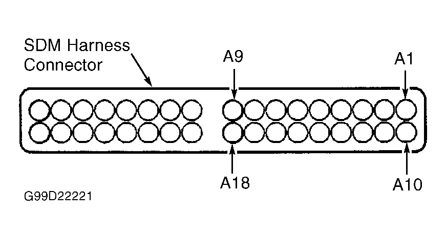 - Disconnect Sensing and Diagnostic Module (SDM) harness connector. SDM is located under passenger seat. Check continuity between ground and SDM harness connector terminal A1 (Blue/Red wire). See Fig 1 . If continuity does not exist, go to next step. If continuity exists, go to step 10 .