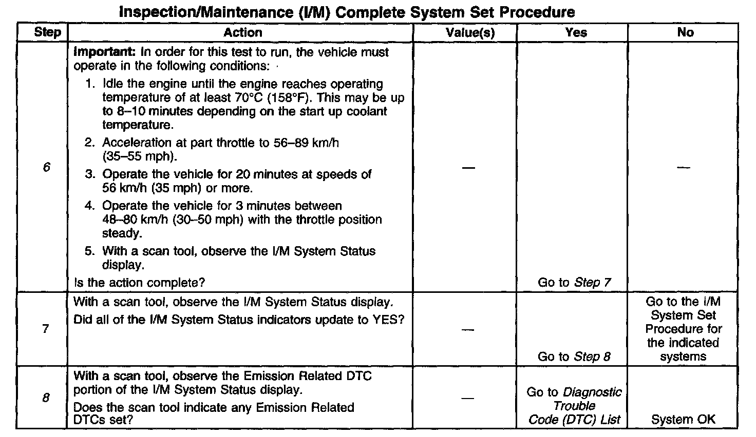 DESCRIPTIONThe purpose of the I/M Complete System Set Procedure is to satisfy the enable criteria necessary to execute all of the I/M readiness diagnostics, and complete the trips for those particular diagnostics. When all diagnostic tests are completed, the I/M System Status indicators are set to YES. Perform this test when more than one or all of the I/M System Status indicators are set to NO.