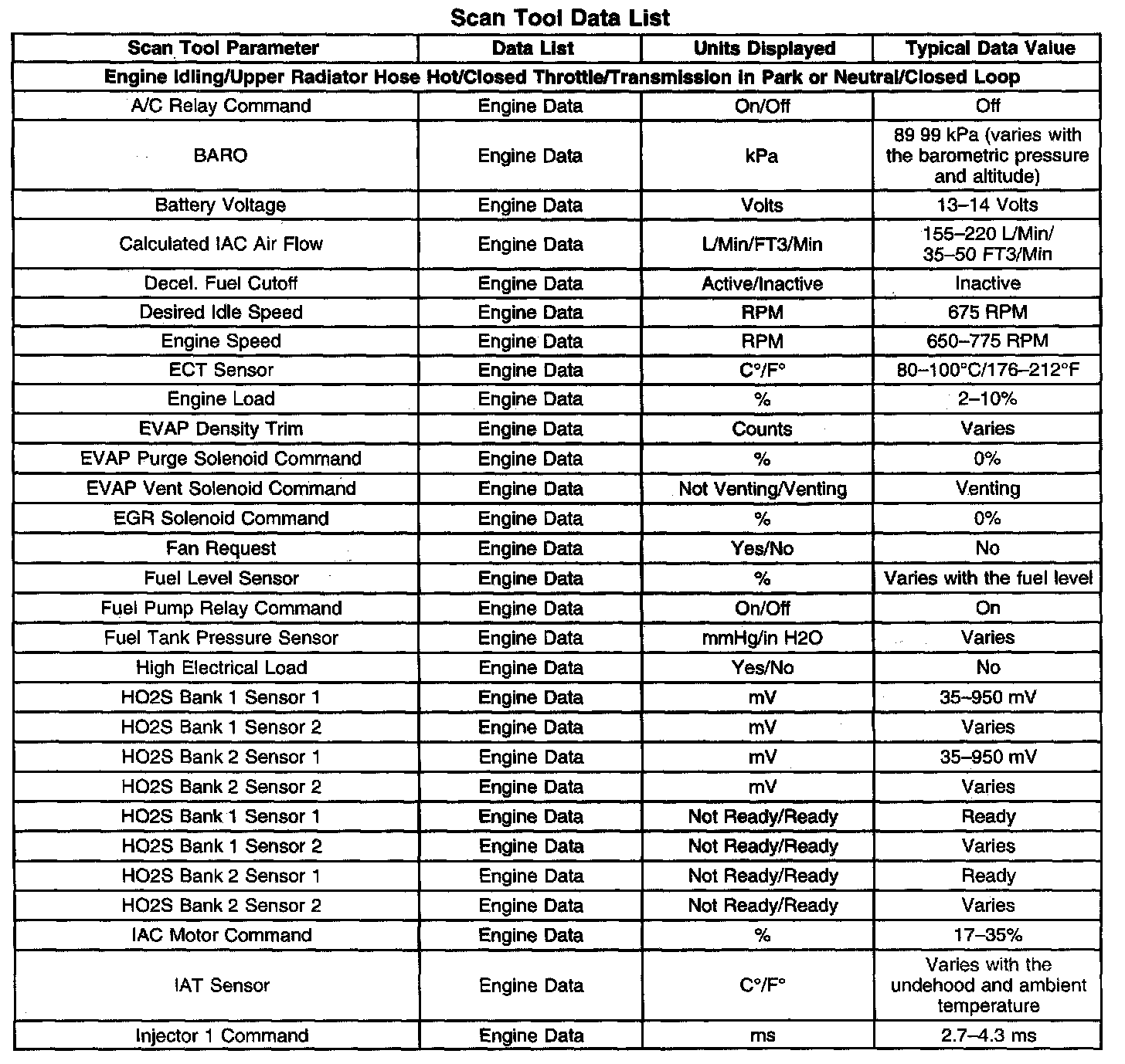 ^ On-board diagnostics are functioning properly. The scan tool values from a correctly operating engine may be used for comparison with the engine you are diagnosing. The values listed in the following table represent typical values that would be seen on a good running engine.