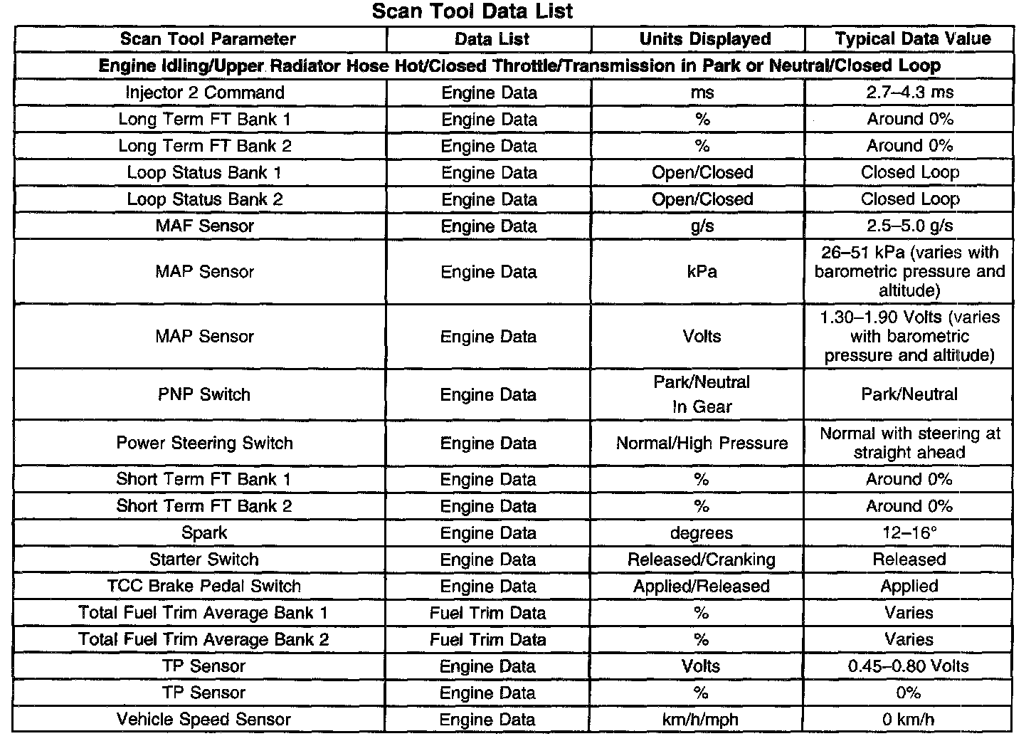 The Engine Scan Tool Data List contains all engine related parameters that are available on the scan tool. The list is arranged in the alphabetical order.
