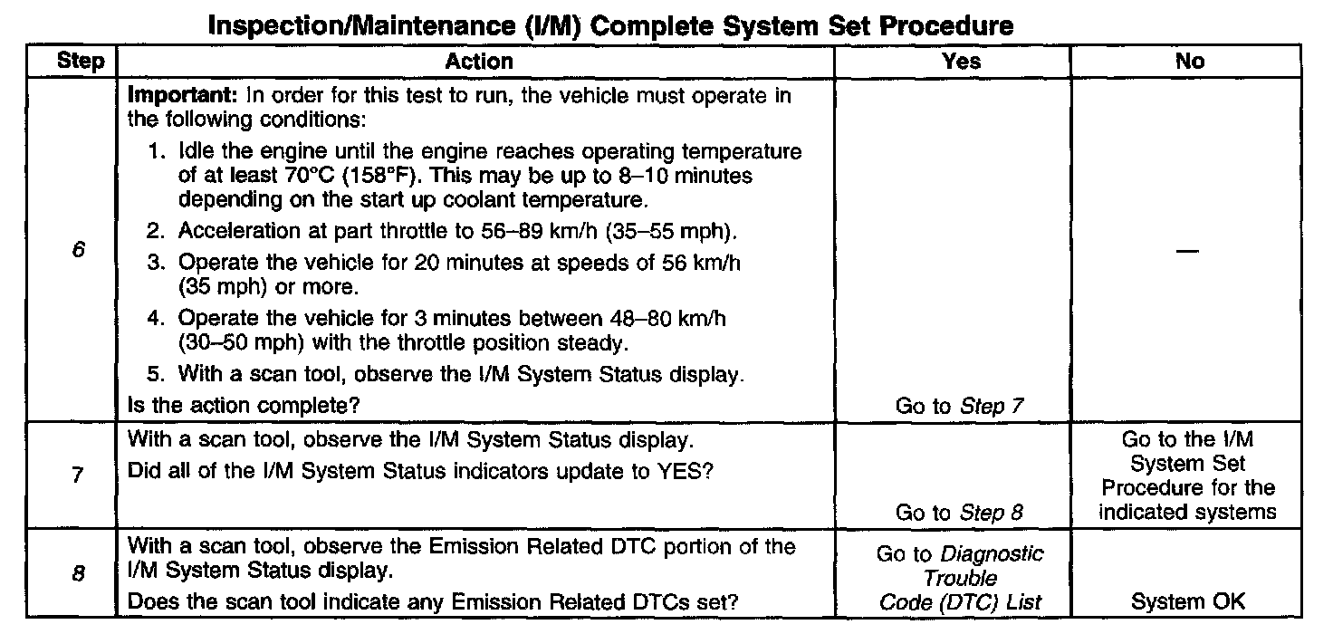 Home >> Chevrolet >> 2001 >> Tracker 4WD L4-1.6L VIN 6 >> Repair and Diagnosis >> Powertrain Management >> Computers and Control Systems >> Testing and Inspection >> Monitors, Trips, Drive Cycles and Readiness Codes >> Inspection/Maintenance (I/M) System Set Procedures >> I/M Complete System Set Procedure