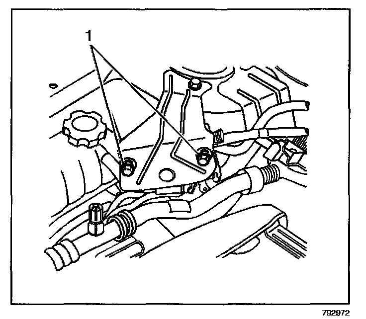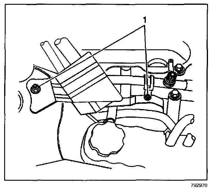 10. Remove the bolt and nut (1) from the cruise control module mounting bracket.