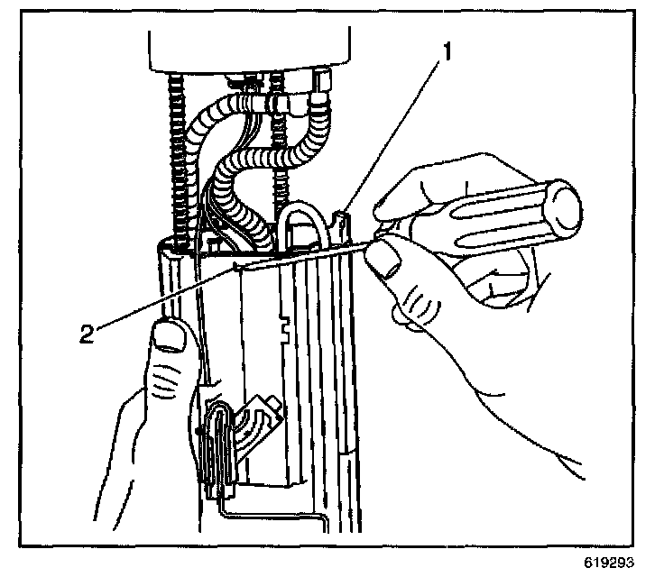 2. Remove the fuel pump and fuel level sensor electrical retaining clip at the top of the fuel sender assembly.