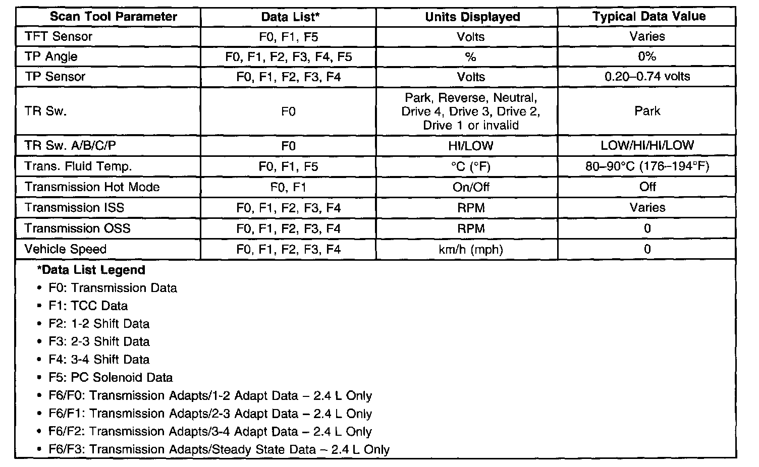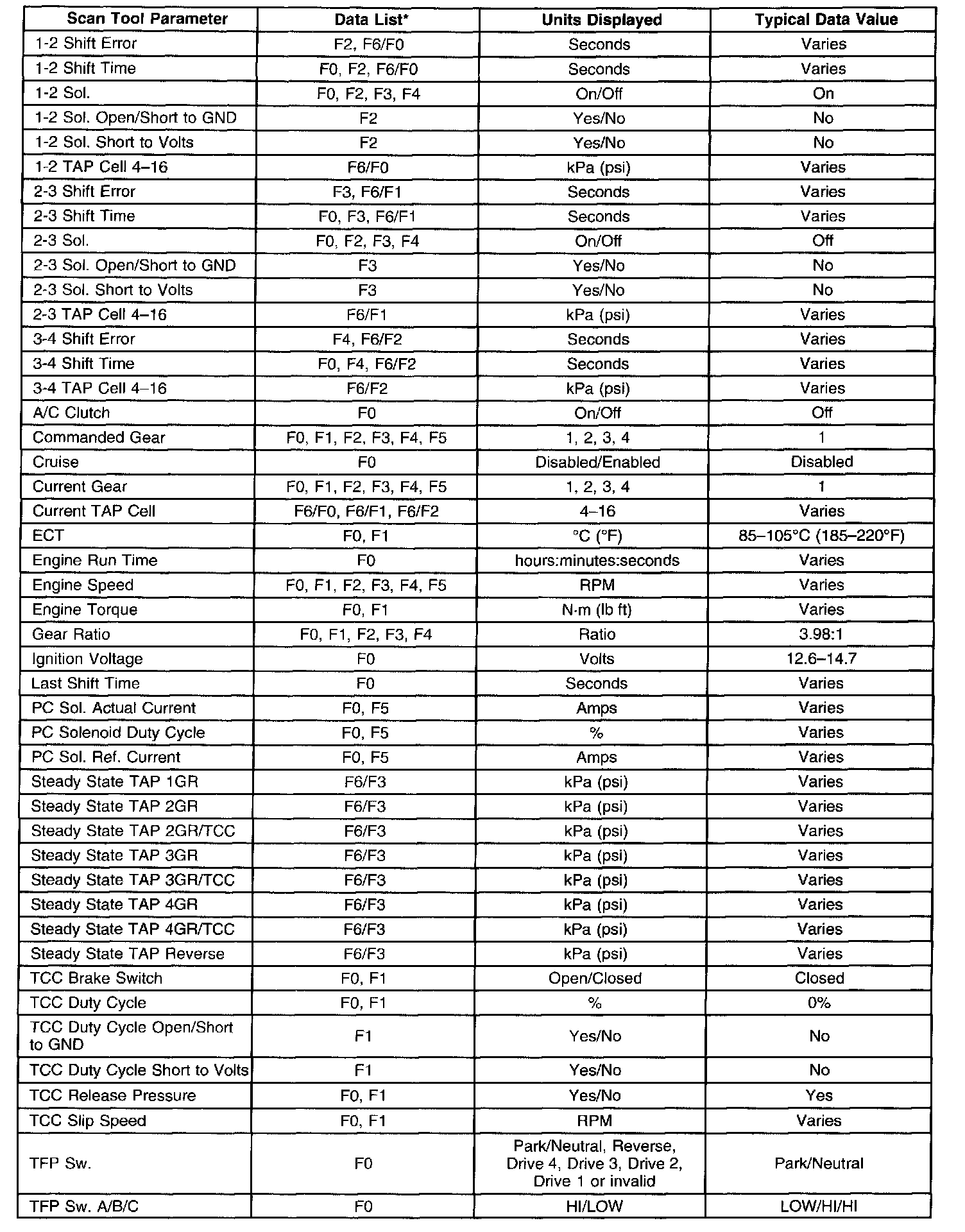 Home >> Chevrolet >> 2002 >> Cavalier L4-2.2L VIN F >> Repair and Diagnosis >> Powertrain Management >> Transmission Control Systems >> Testing and Inspection >> Scan Tool Data List