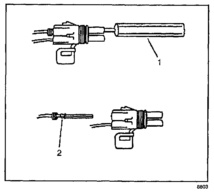 4. Insert the Weather Pack(R) terminal removal tool into the front (mating end) of the connector cavity until it rests on the cavity shoulder (1).