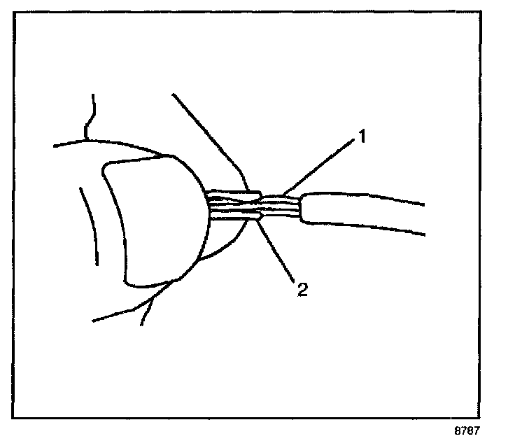 7. Center the splice clip (2) over the stripped wires (1) and hold the clip in place.