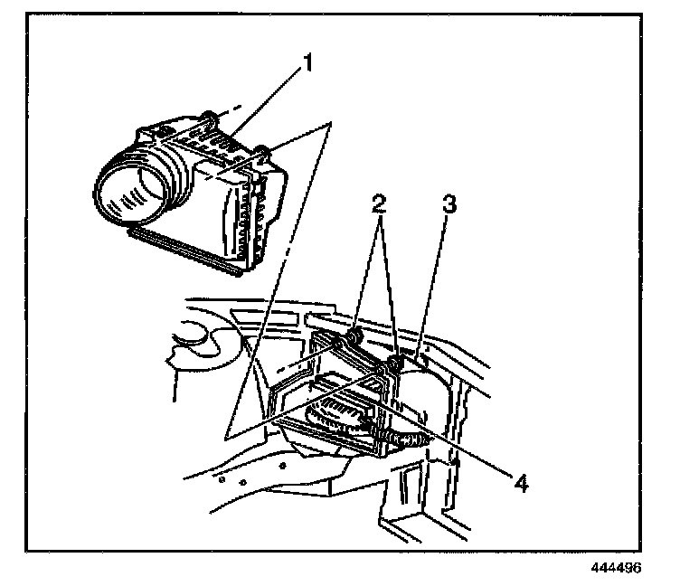 3. Without disconnecting the powertrain control module (PCM) connectors, remove the PCM (4) and the harness from the air cleaner housing.