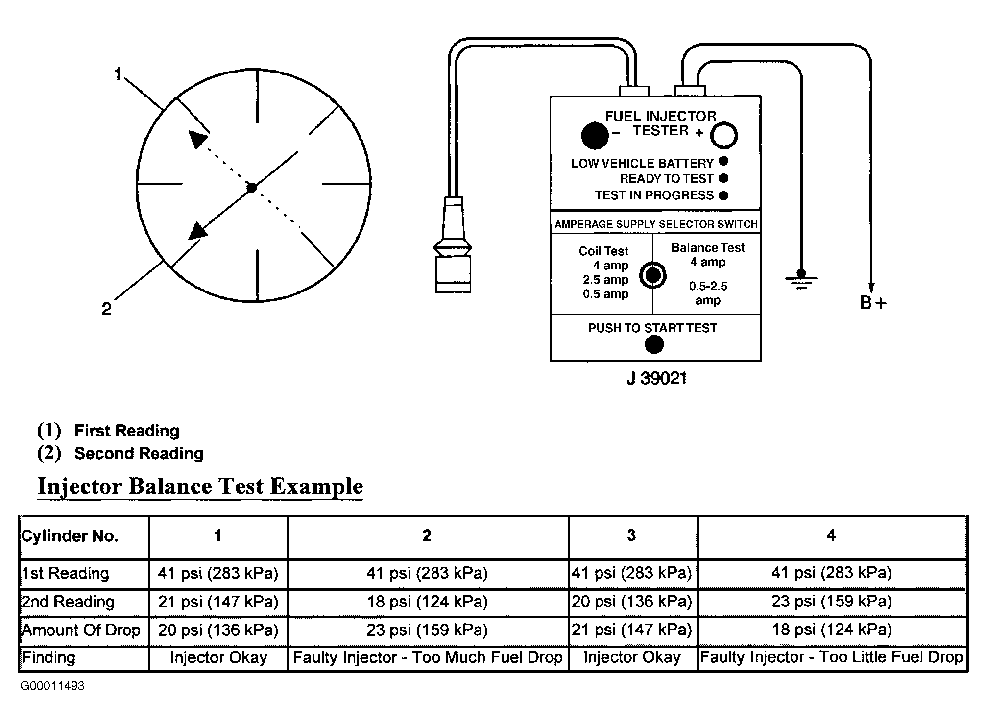 The fuel injectors are flowing properly if pressure drop value for each fuel injector is within 1.5 psi (10.0 kPa) of average pressure drop value. Calculate pressure drop value for each fuel injector by subtracting second pressure reading from first pressure reading. See Fig 1.