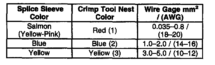 4. Select the proper sealed splice sleeve according to the wire size. Refer to the above table at the beginning of the repair procedure for the color coding of the splice sleeves and the crimp tool nests.
