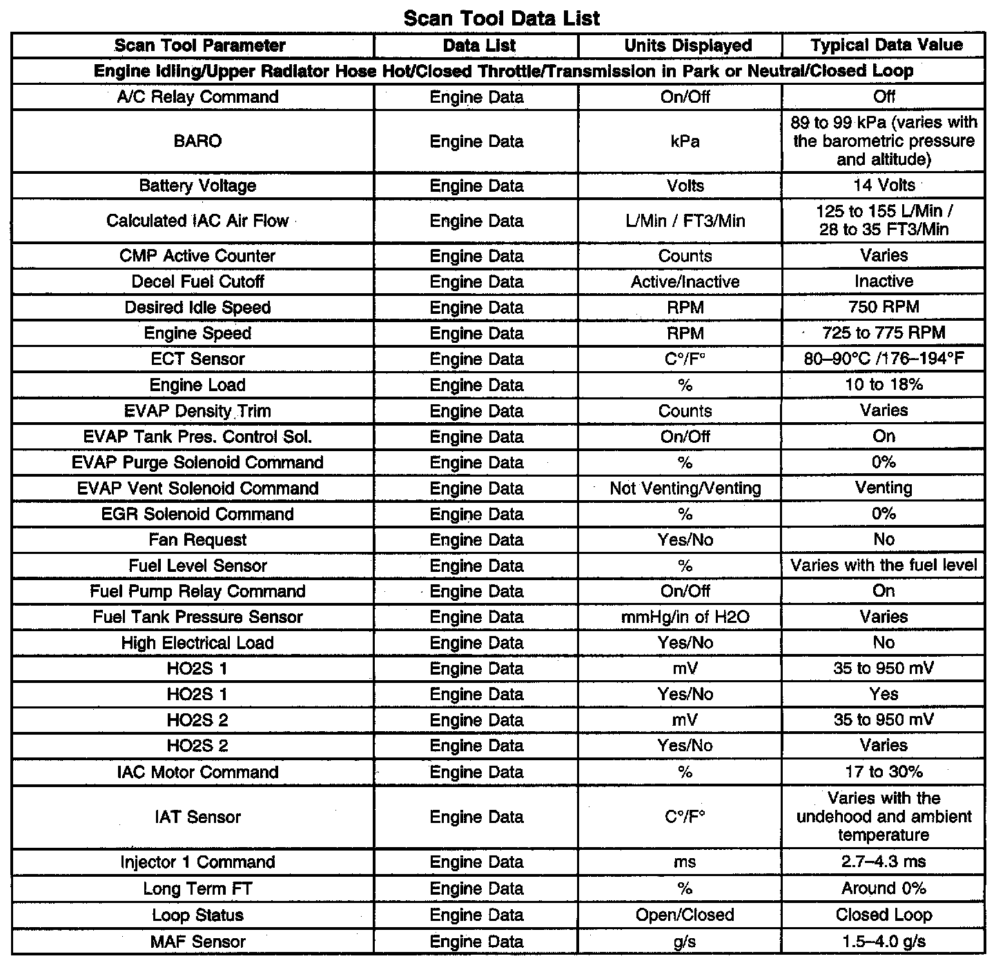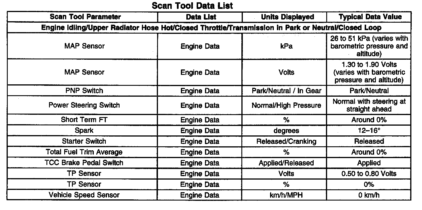 The Engine Scan Tool Data List contains all engine related parameters that are available on the scan tool. The list is arranged in the alphabetical order.