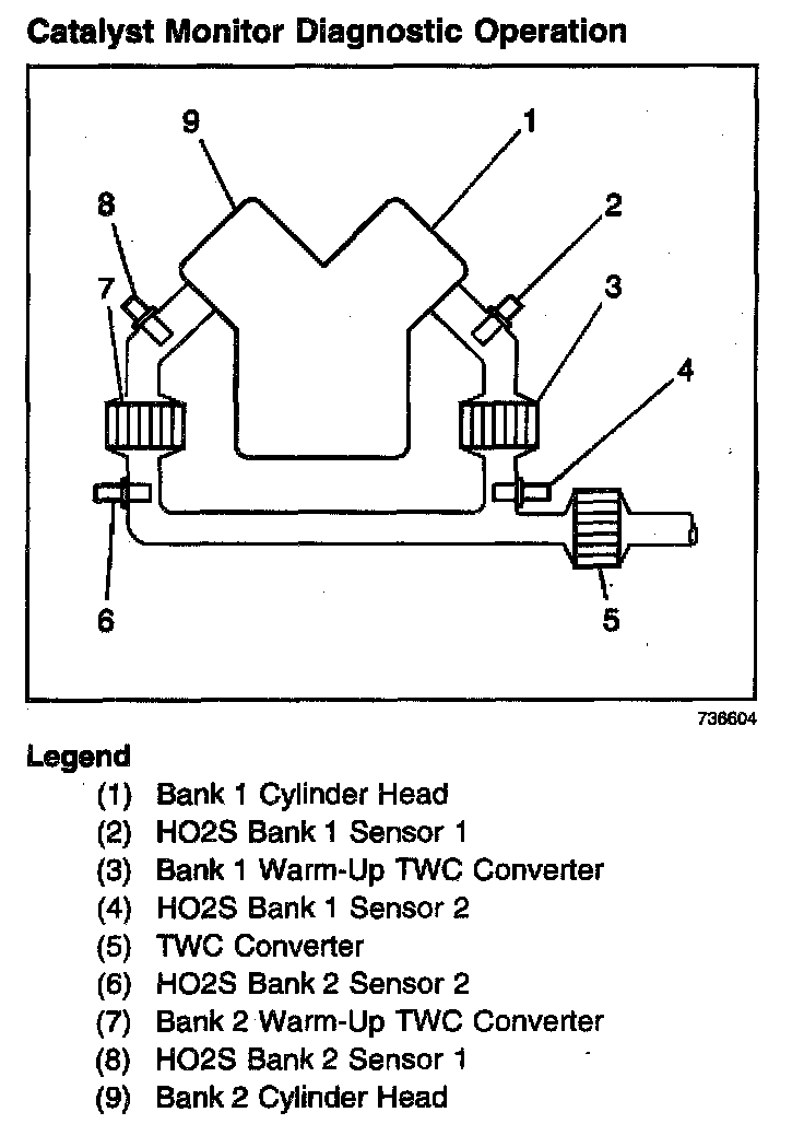 The OBD 2 catalyst monitor diagnostic measures the oxygen storage capacity of the 3-Way Catalytic Converter (TWC). Heated Oxygen Sensors (HO2S) are used to monitor exhaust gas oxygen content. The HO2S 1 or pre-catalyst sensor is installed before the TWC converter. The HO2S 2 or post-catalyst sensor is installed after the TWC converter. Voltage variations between the sensors allow the PCM to determine the performance of the TWC catalyst. When the TWC catalyst becomes less effective in promoting chemical reactions, the catalyst capacity to store and release oxygen is generally degraded. The OBD 2 catalyst monitor diagnostic is based on a correlation between the conversion efficiency of the TWC converter catalyst and the oxygen storage capacity of the catalyst. A good catalyst, e.g. 95 percent hydrocarbon conversion efficiency, will show a relatively flat output voltage on the post-catalyst HO2S. A degraded catalyst, 65 percent hydrocarbon conversion, will show greatly increased activity in the output voltage from the post catalyst HO2S.