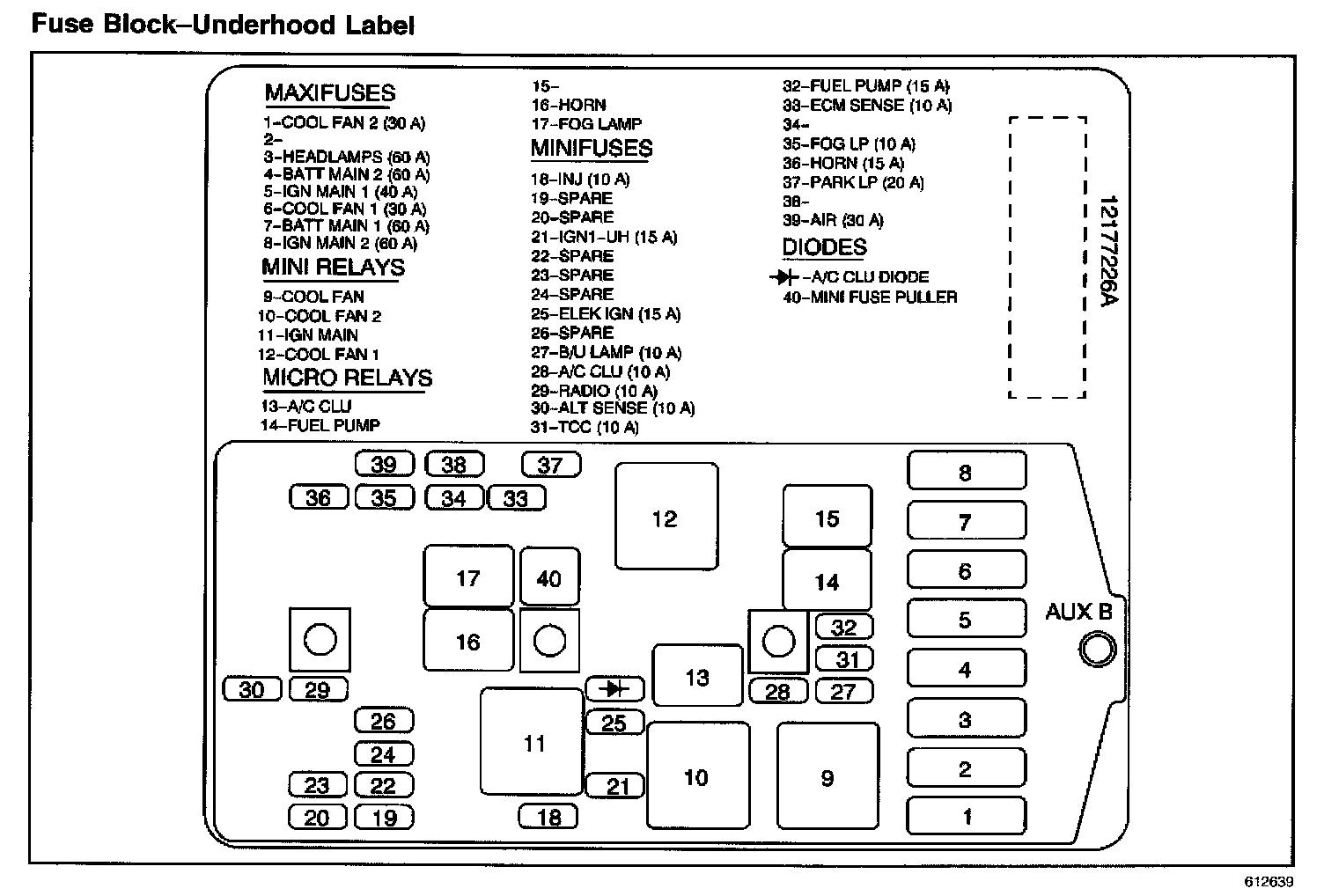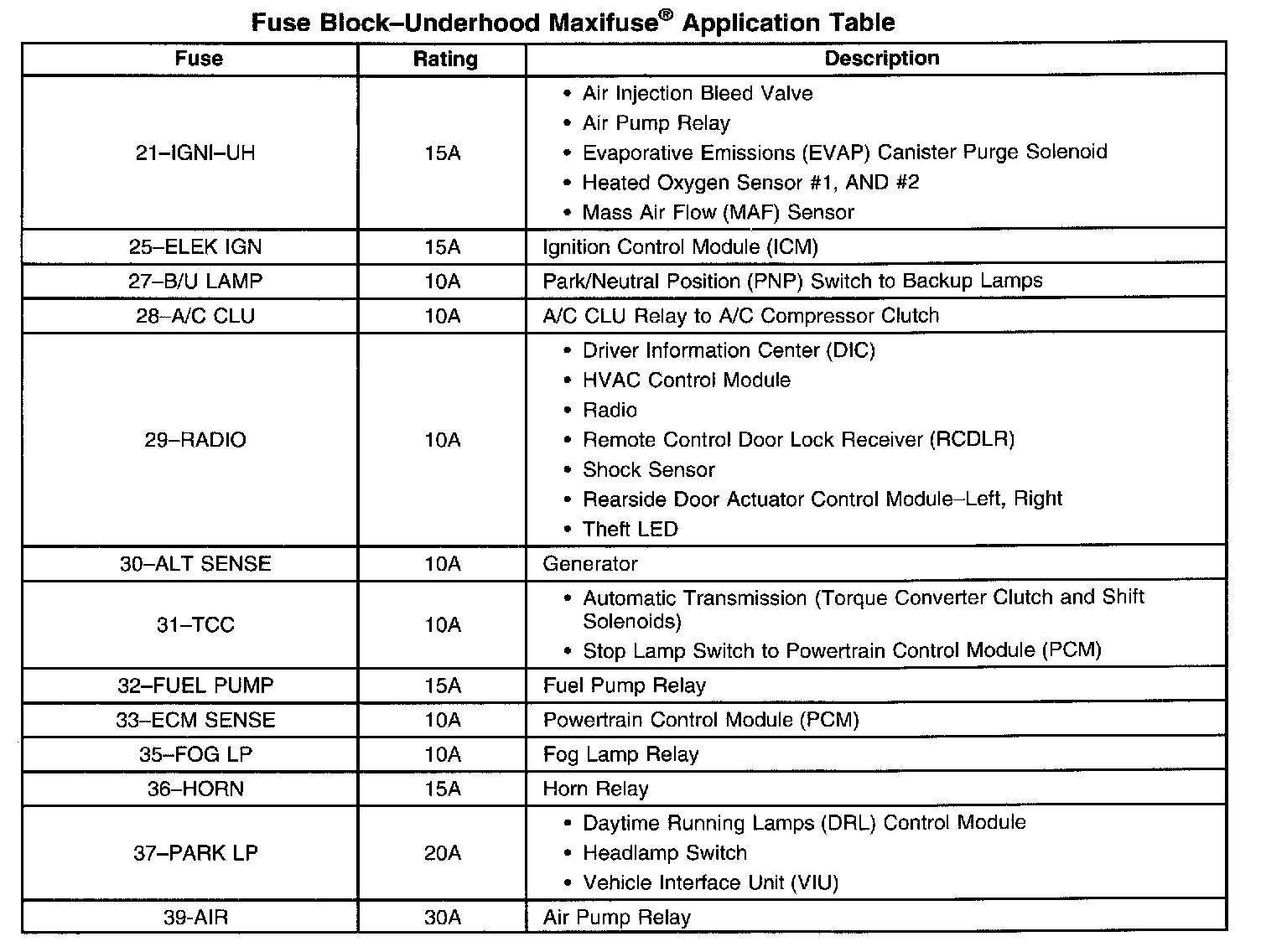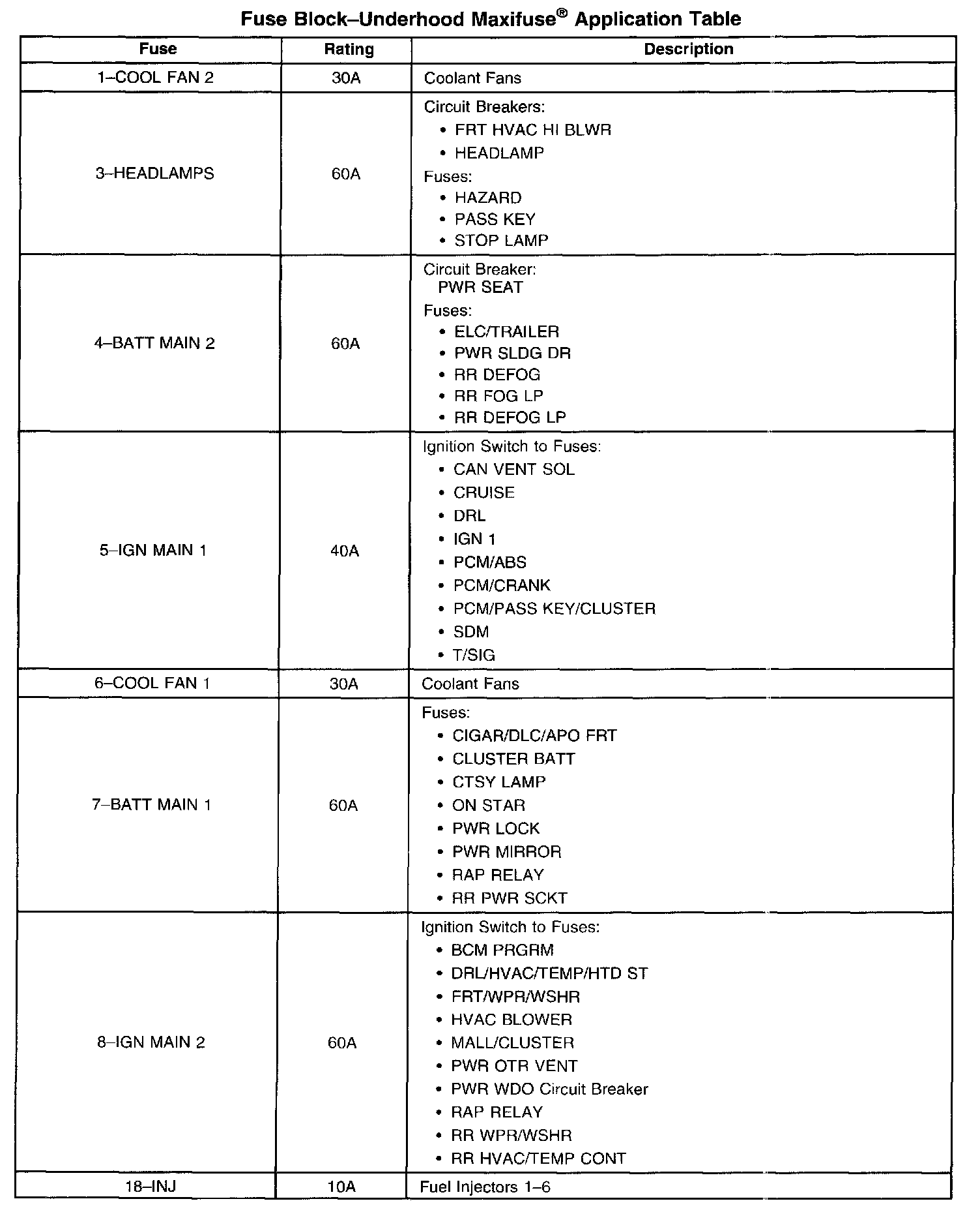 Fuse Block - Underhood Maxifuse(R) Application Table Part 1: