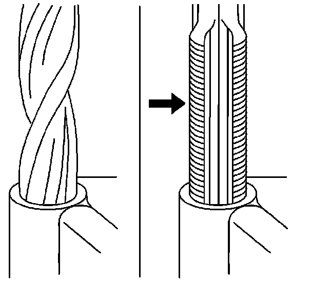 IMPORTANT: Refer to the thread repair kit manufacturer's instructions regarding the size of the drill and tap to use. Avoid any buildup of chips. Back out the tap every few turns and remove the chips.