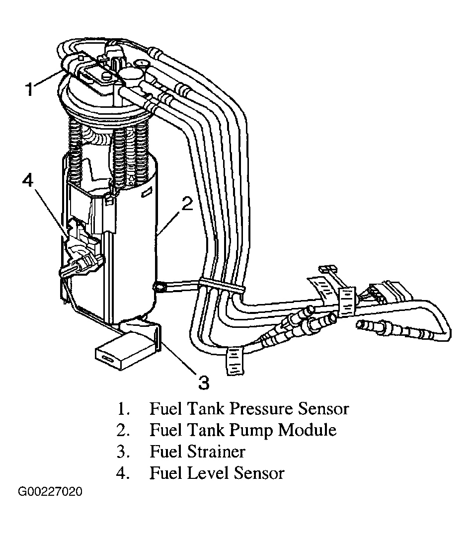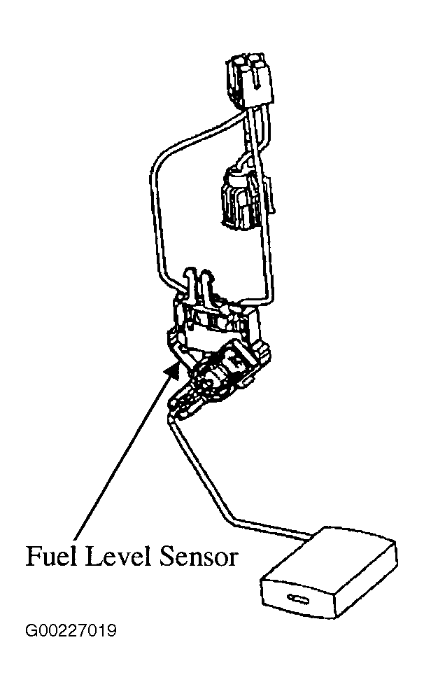 The fuel level sensor consists of a float, a wire float arm, and a ceramic resistor card. See Fig 1. Fuel level sensor is part of the fuel sender assembly, located in the fuel tank. See Fig 2. The position of the float arm indicates the fuel level. The fuel level sensor contains a variable resistor which changes resistance in correspondence with the amount of fuel in the fuel tank. The Powertrain Control Module (PCM) sends the fuel level information via the Class 2 circuit to the Instrument Panel (IP) cluster. This information is used for the IP fuel gage and the low fuel warning indicator, if applicable. The PCM also monitors the fuel level input for various diagnostics.