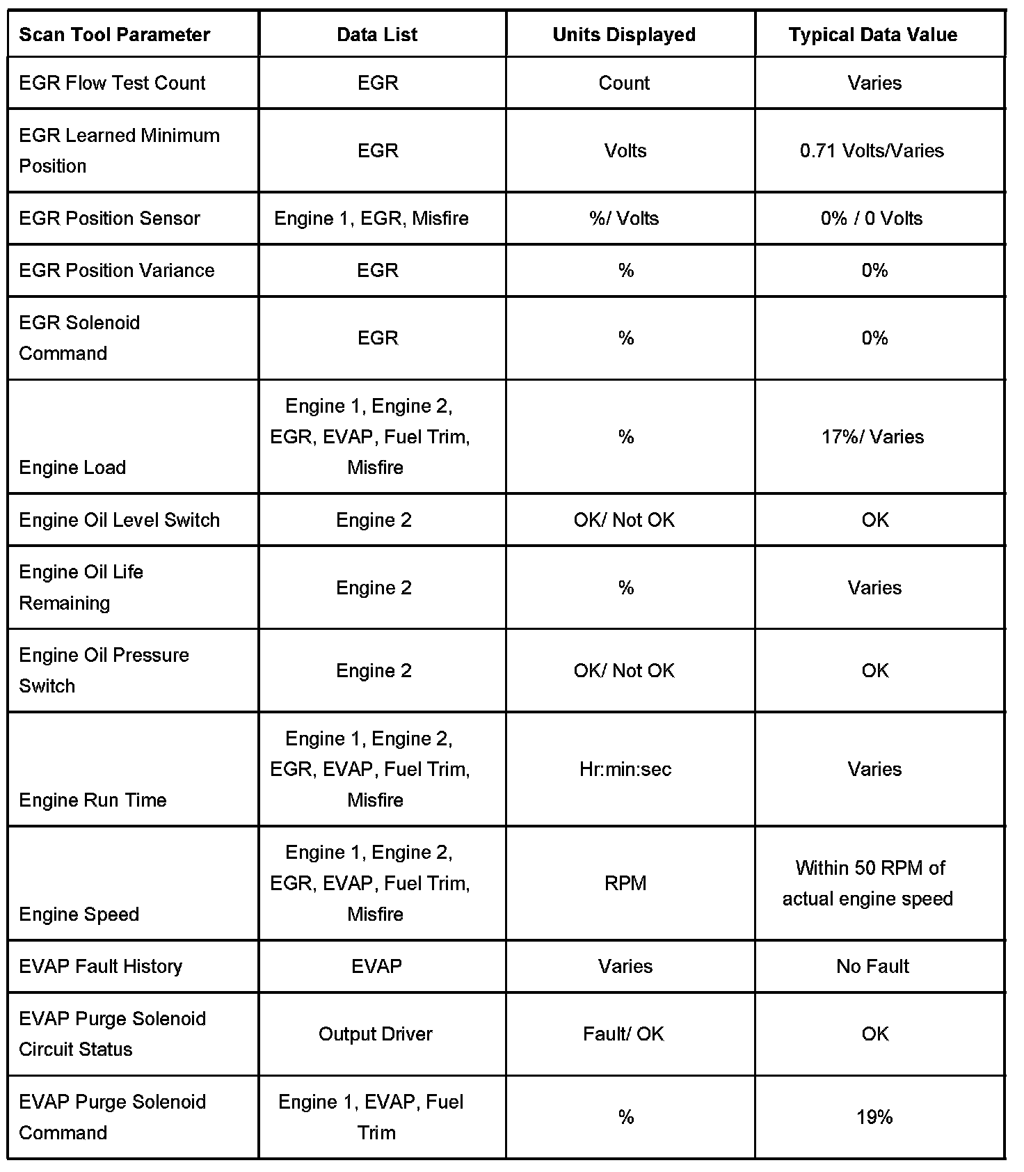 - EGR Data - Contains information specific to the exhaust gas recirculation (EGR) system. This list displays parameters required to verify proper EGR system operation