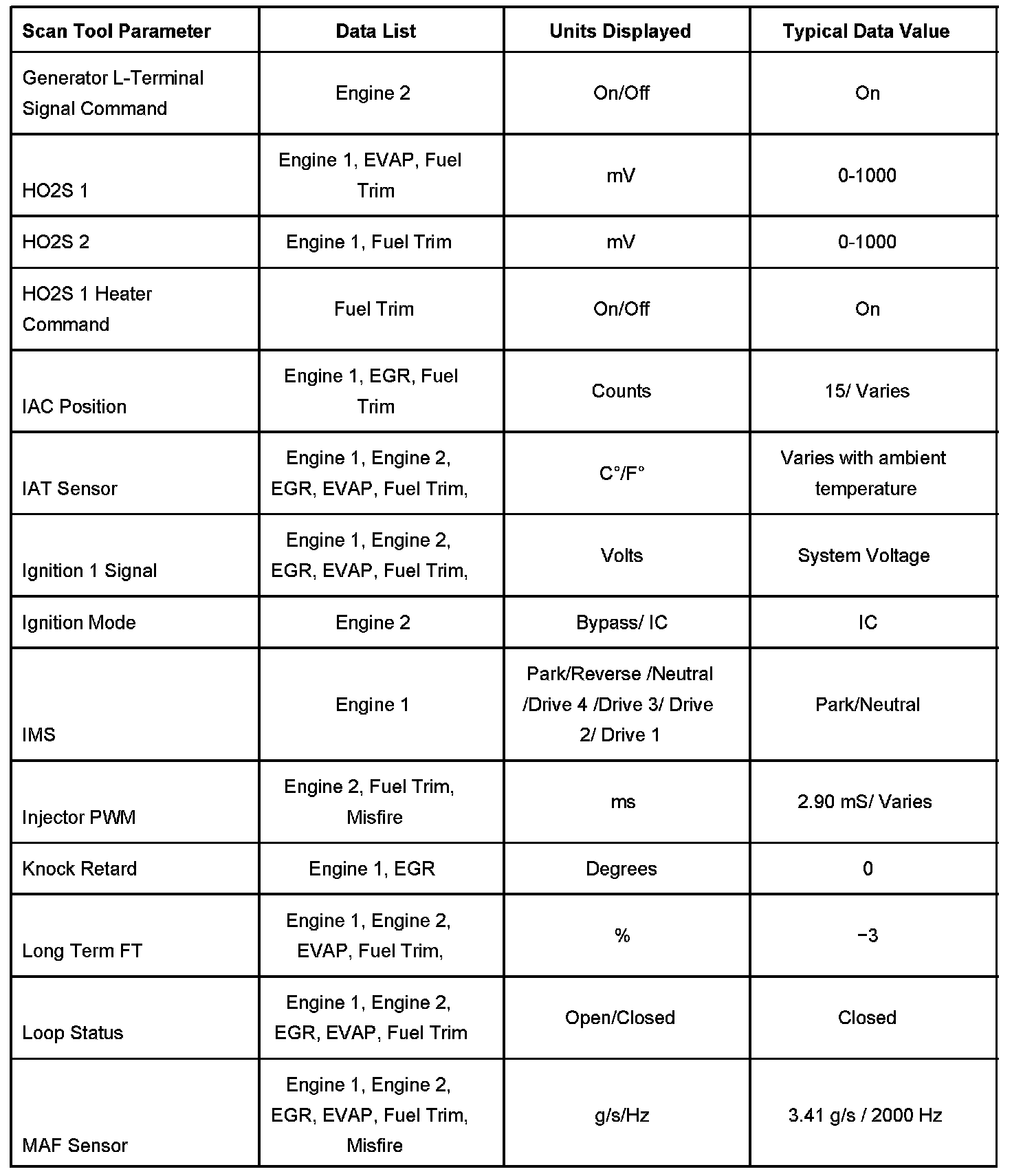 Use the Typical Scan Data Values table only after the Diagnostic System Check - Computers and Controls Systems has been completed, no DTCs were noted, and you have determined the on-board diagnostics are functioning properly. Scan tool values from a properly running engine may be used for comparison with the engine you are diagnosing. The Typical Scan Data values represent values that would be seen on a normally running engine.