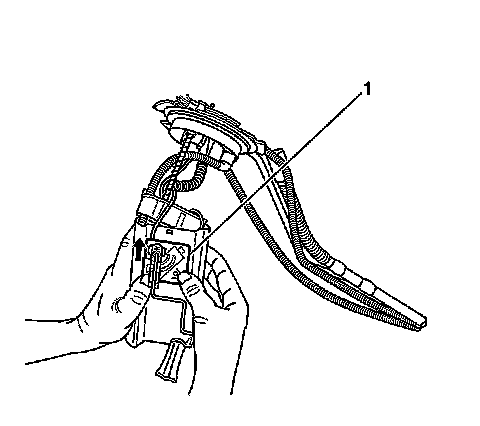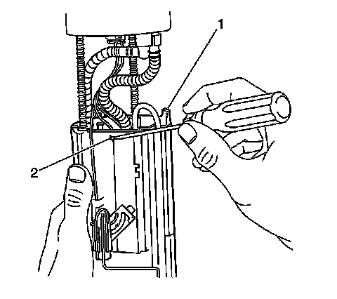 5. Depress the tab on the fuel level sensor (1) while sliding up and out of the housing.
