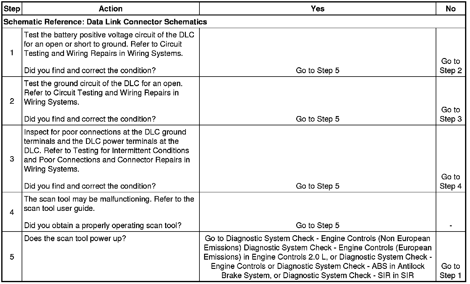 The data link connector (DLC) provides operating power for the scan tool at terminal 16. The ground for the scan tool is provided at terminal 4. The 16 pin DLC provides the serial data signals terminal 7 (ECM, TCM, ISU, EBCM), terminals 3 (2.5 L speed sensitive power steering), terminal 14 (2.0 l speed sensitive power steering), and terminal 13 (SIR serial data). The scan tool will power up with the ignition OFF. The ignition must be ON in order for the scan tool to communicate with a control module.