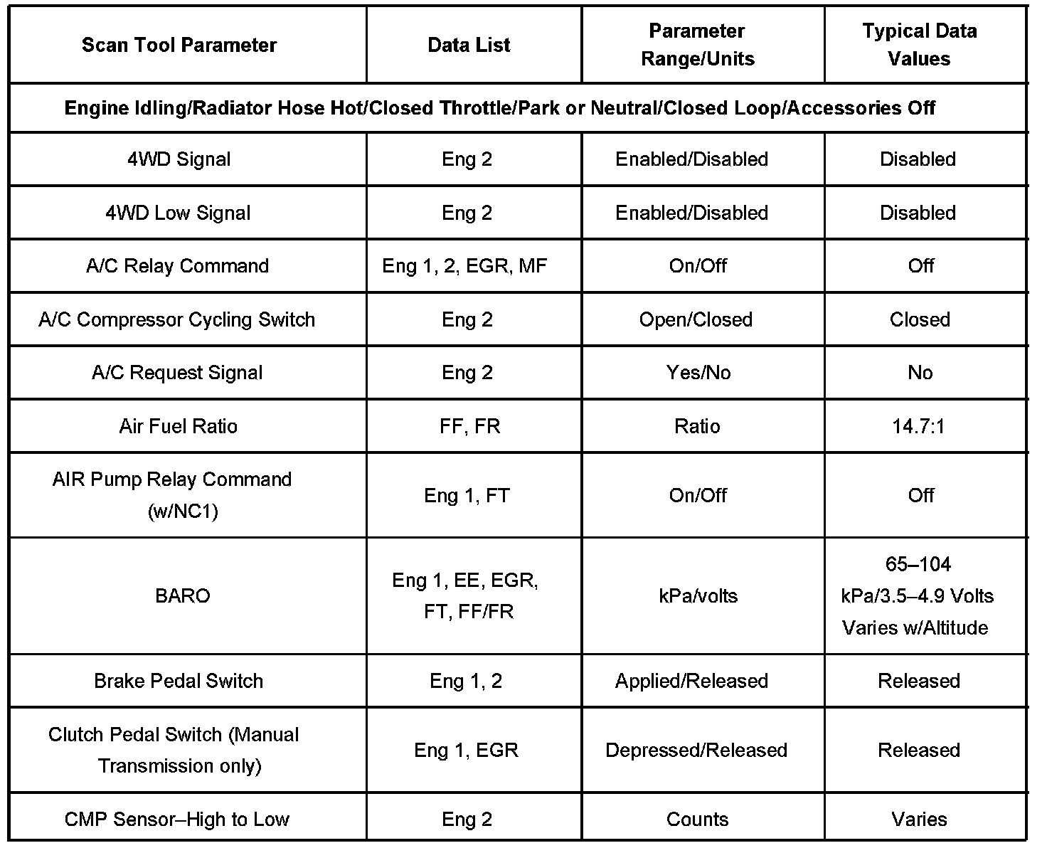 Scan tool values from a properly running engine may be used for comparison with the engine you are diagnosing. The Engine Scan Tool Data List represents values that would be seen on a normal running engine.