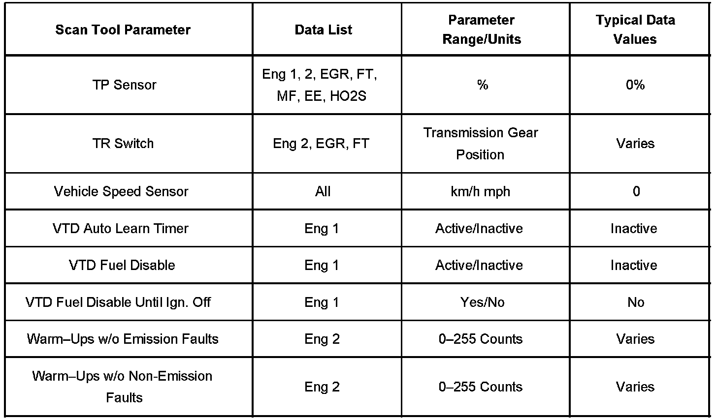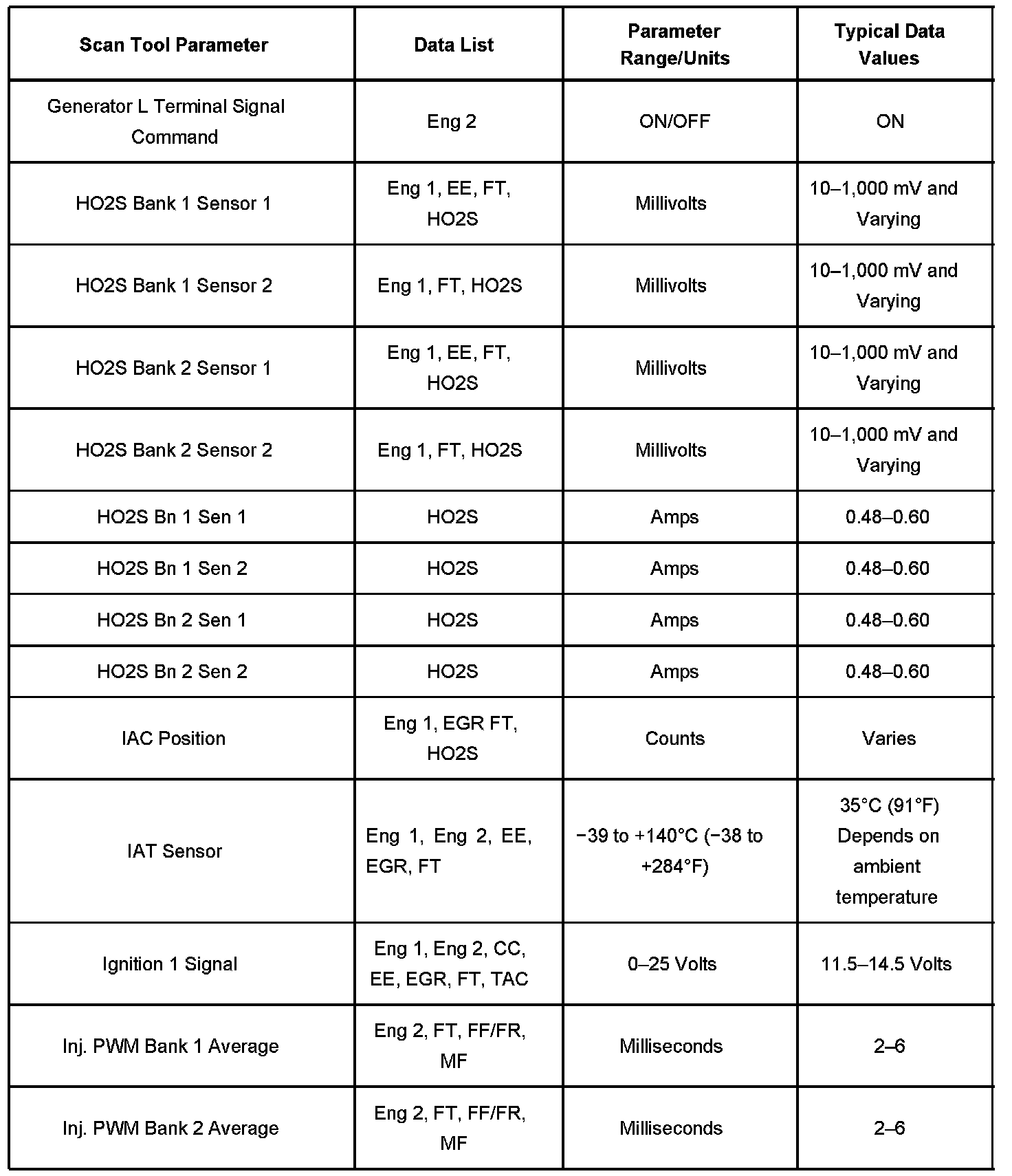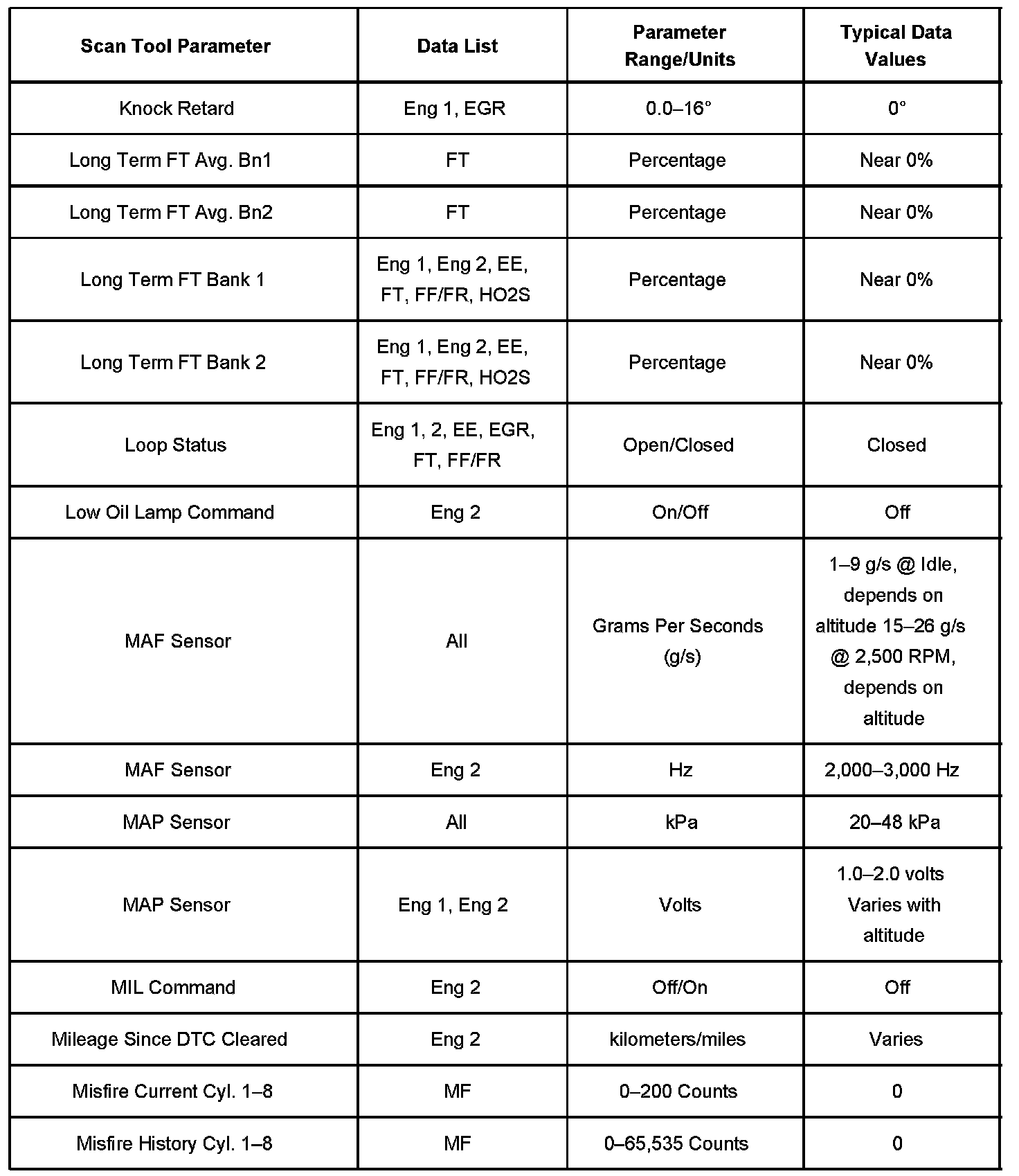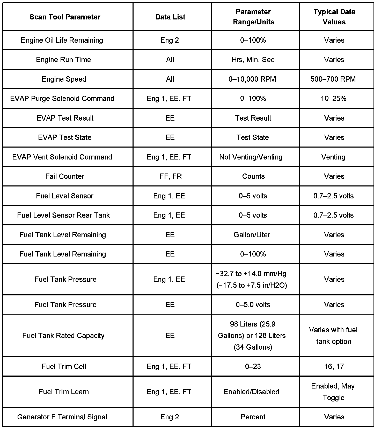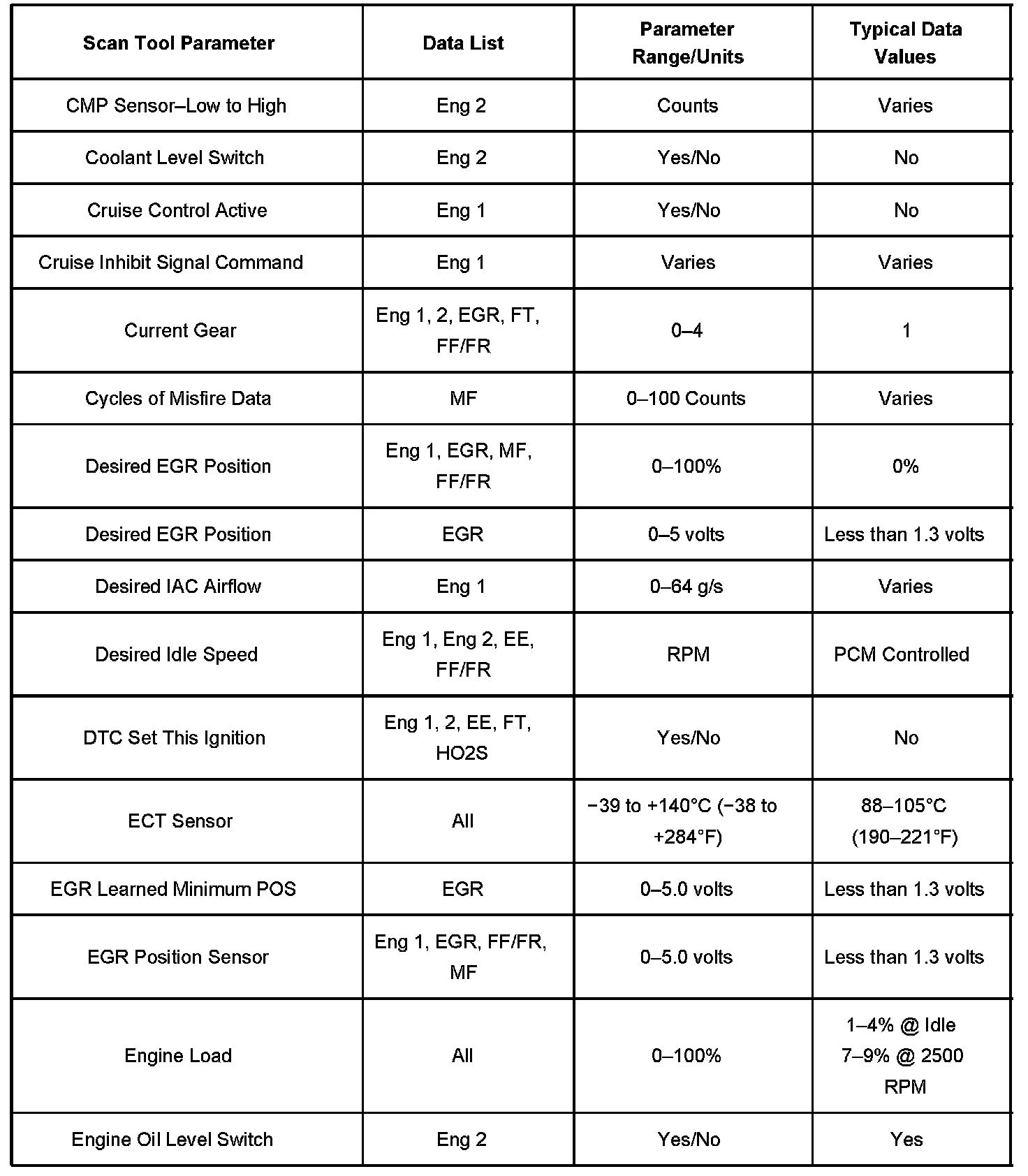 The Engine Scan Tool Data List contains all engine related parameters that are available on the scan tool. The list is arranged in alphabetical order. A given parameter may appear in any one of the data lists, and in some cases may appear more than once, or in more than one data list in order to group certain related parameters together.