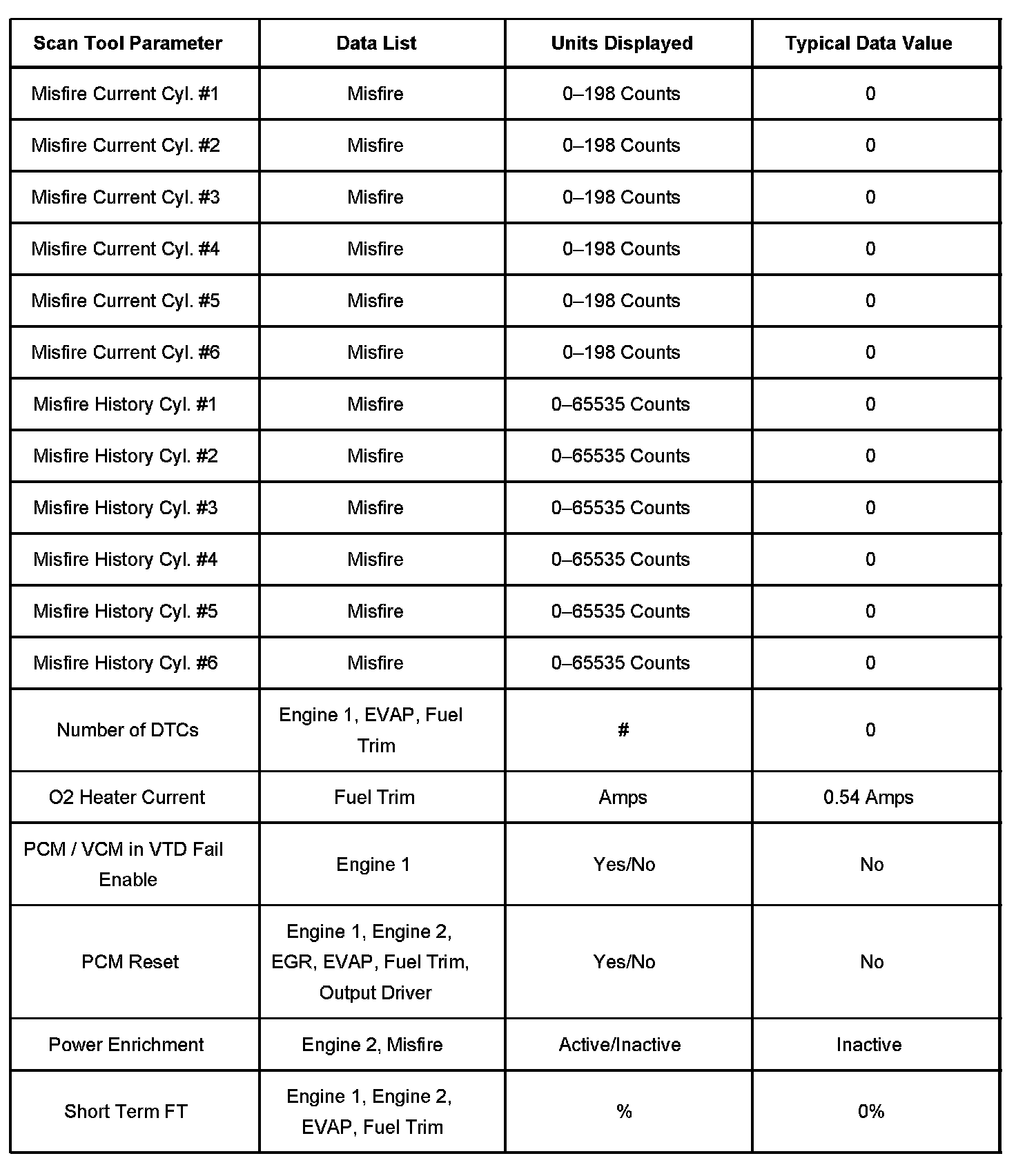 - Misfire Data-Contains information specific to the misfire diagnostics and parameters required to verify proper operation with regard to misfire.
