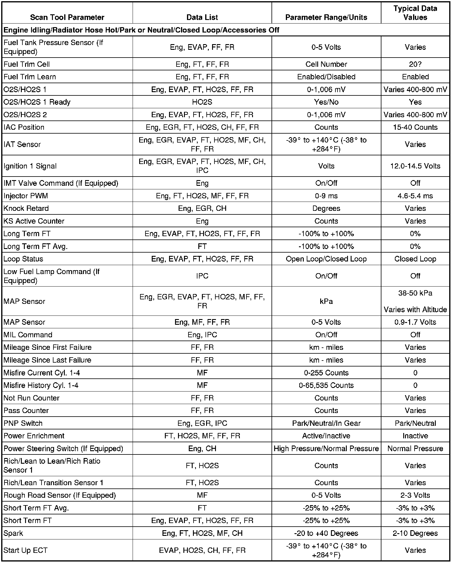 The Engine Scan Tool Data List contains all engine related parameters that are available on the scan tool. The list is arranged in alphabetical order. A parameter may appear in any one of the data lists, and in some cases may appear more than once, or in more than one data list in order to group certain related parameters together.