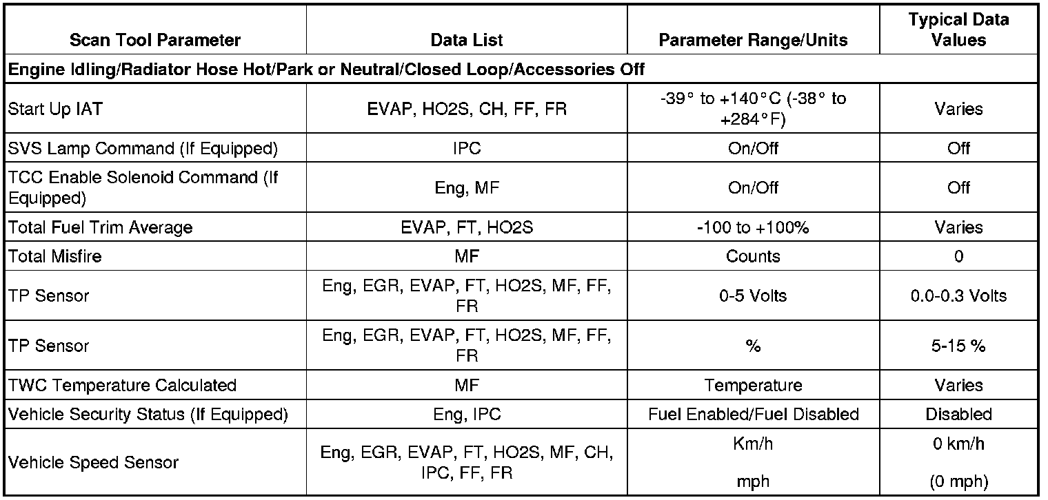 Scan tool values from an engine that is operating correctly may be used for comparison with the engine you are diagnosing. The Engine Scan Tool Data List represents the values that would be seen on a normal operating engine.