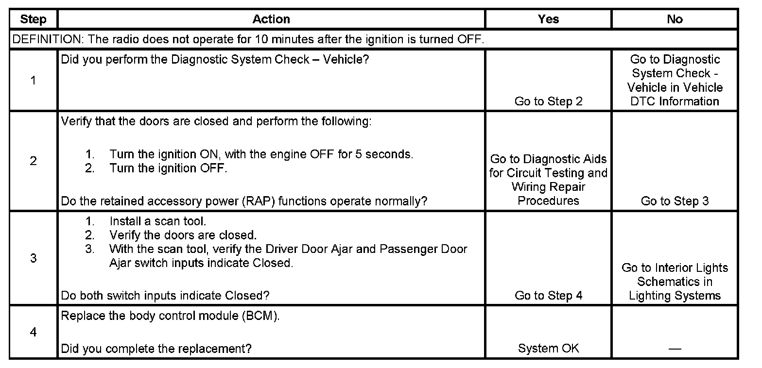All retained accessory power (RAP) functions on this vehicle are controlled by the body control module (BCM) using class 2 serial data. If class 2 communication between the radio, BCM and data link connector (DLC) is functioning properly, and the door ajar switches are working properly, replace the BCM.