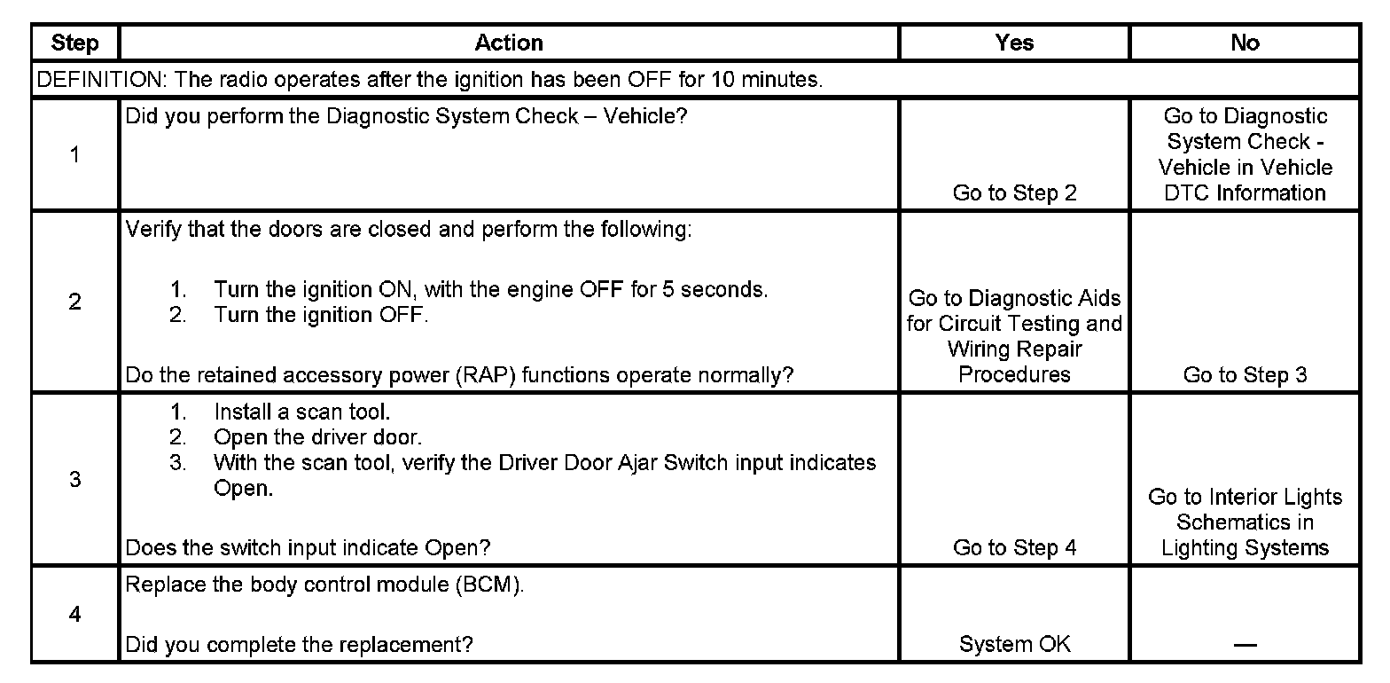 All retained accessory power (RAP) functions on this vehicle are controlled by the body control module (BCM) using class 2 serial data. If class 2 communication between the radio, BCM and data link connector (DLC) is functioning properly, and the door ajar switches are working properly, replace the BCM.