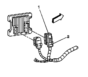 3. Push down on the locking tab (1) and pull up on the release lever (2) and disconnect the PCM harness connectors.