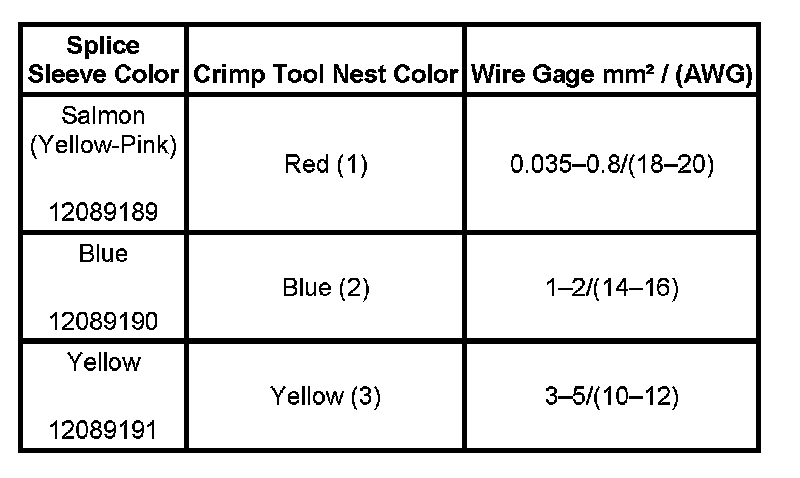 5. Use the Splice Crimp Tool from the J-38125 to crimp duraseal splice sleeve. In order to position the duraseal splice sleeve in the proper color nest of the Splice Crimp Tool, refer to the table at the beginning of this repair procedure.
