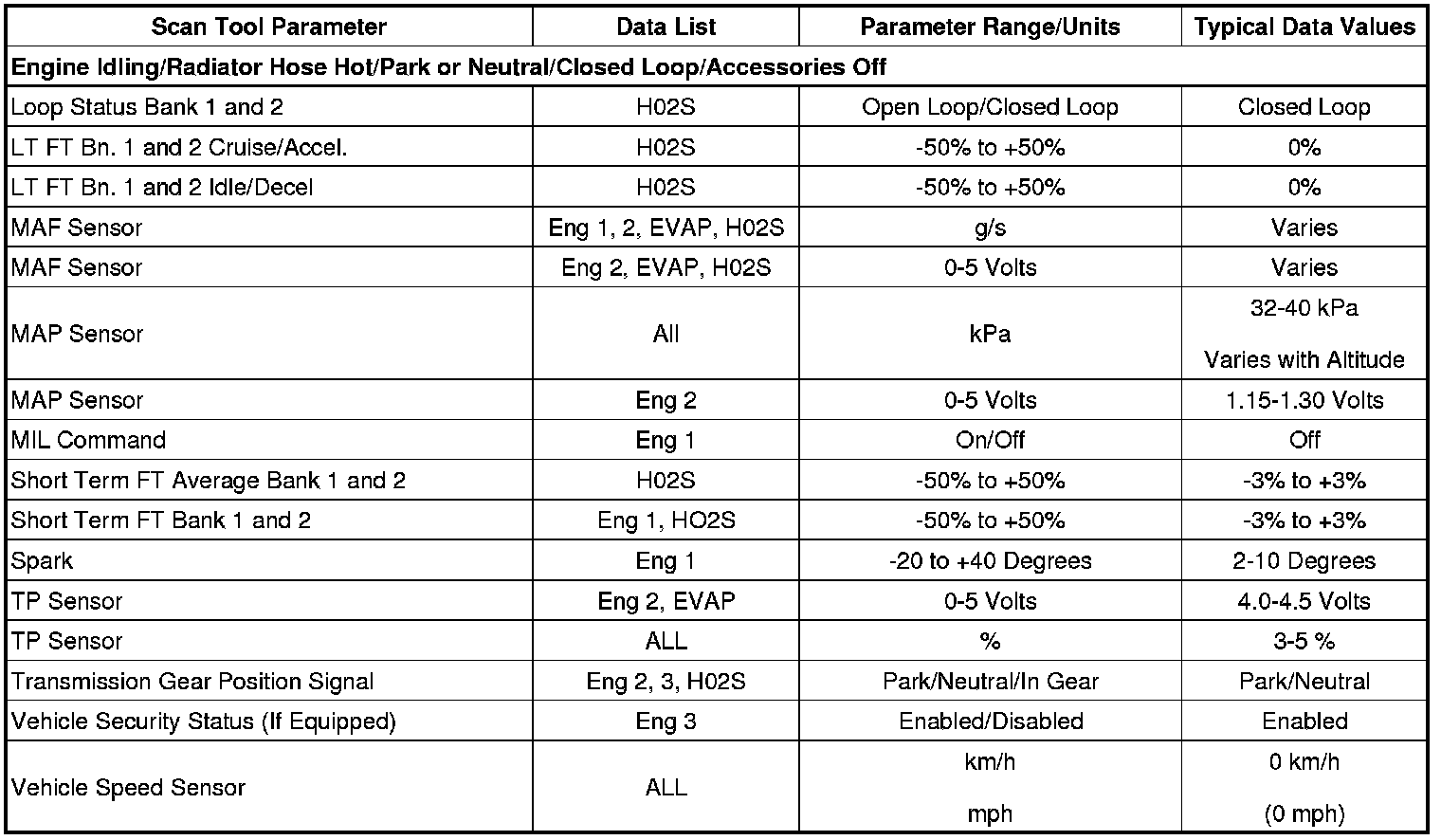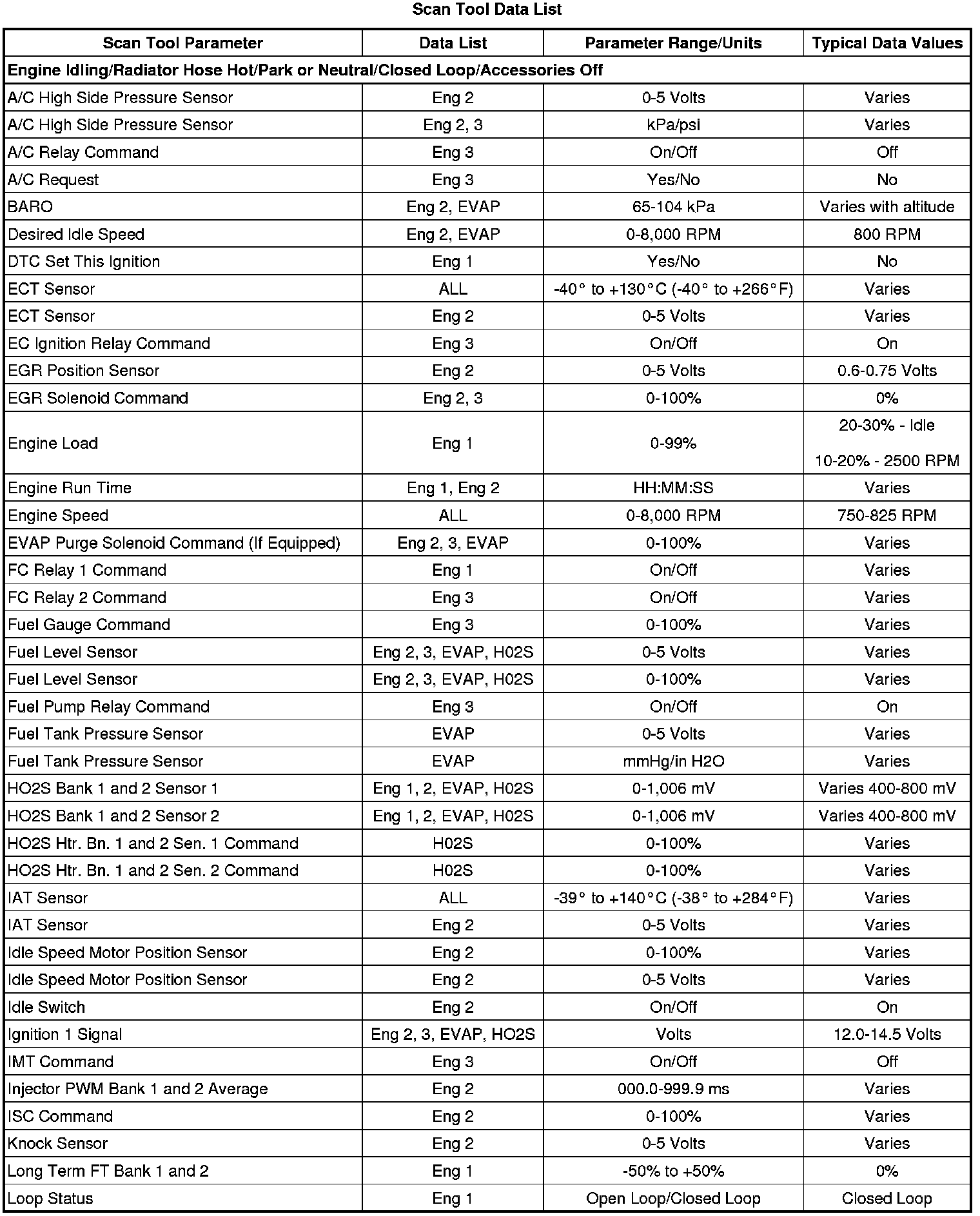 Scan tool values from an engine that is operating correctly may be used for comparison with the engine you are diagnosing. The Engine Scan Tool Data List represents the values that would be seen on a normal operating engine.