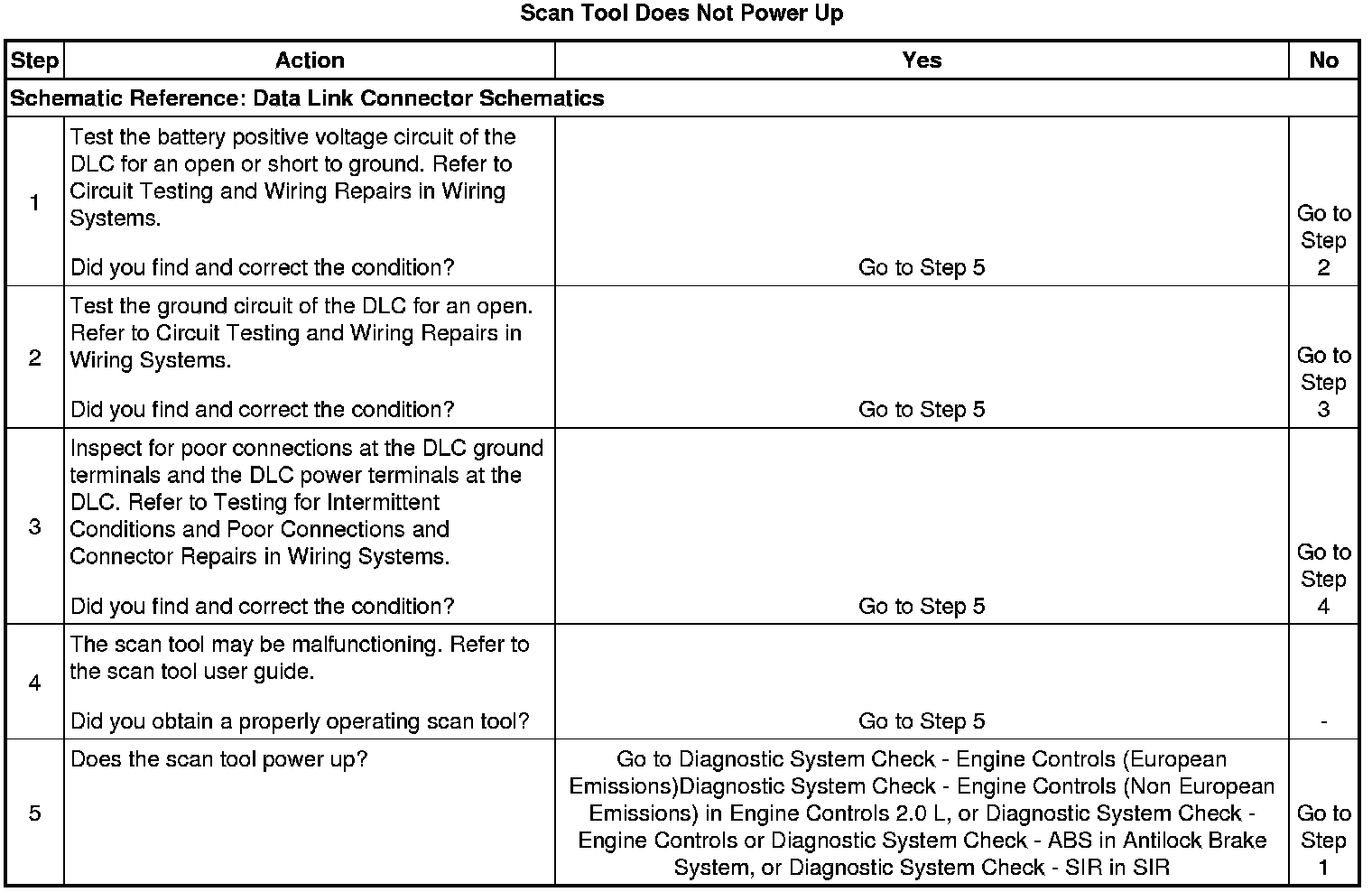 The data link connector (DLC) provides operating power for the scan tool at terminal 16. The ground for the scan tool is provided at terminal 4. The 16 pin DLC provides the serial data signals terminal 7 (ECM, TCM, ISU, EBCM), terminals 3 (2.5 L speed sensitive power steering), terminal 14 (2.0 l speed sensitive power steering), and terminal 13 (SIR serial data). The scan tool will power up with the ignition OFF. The ignition must be ON in order for the scan tool to communicate with a control module.