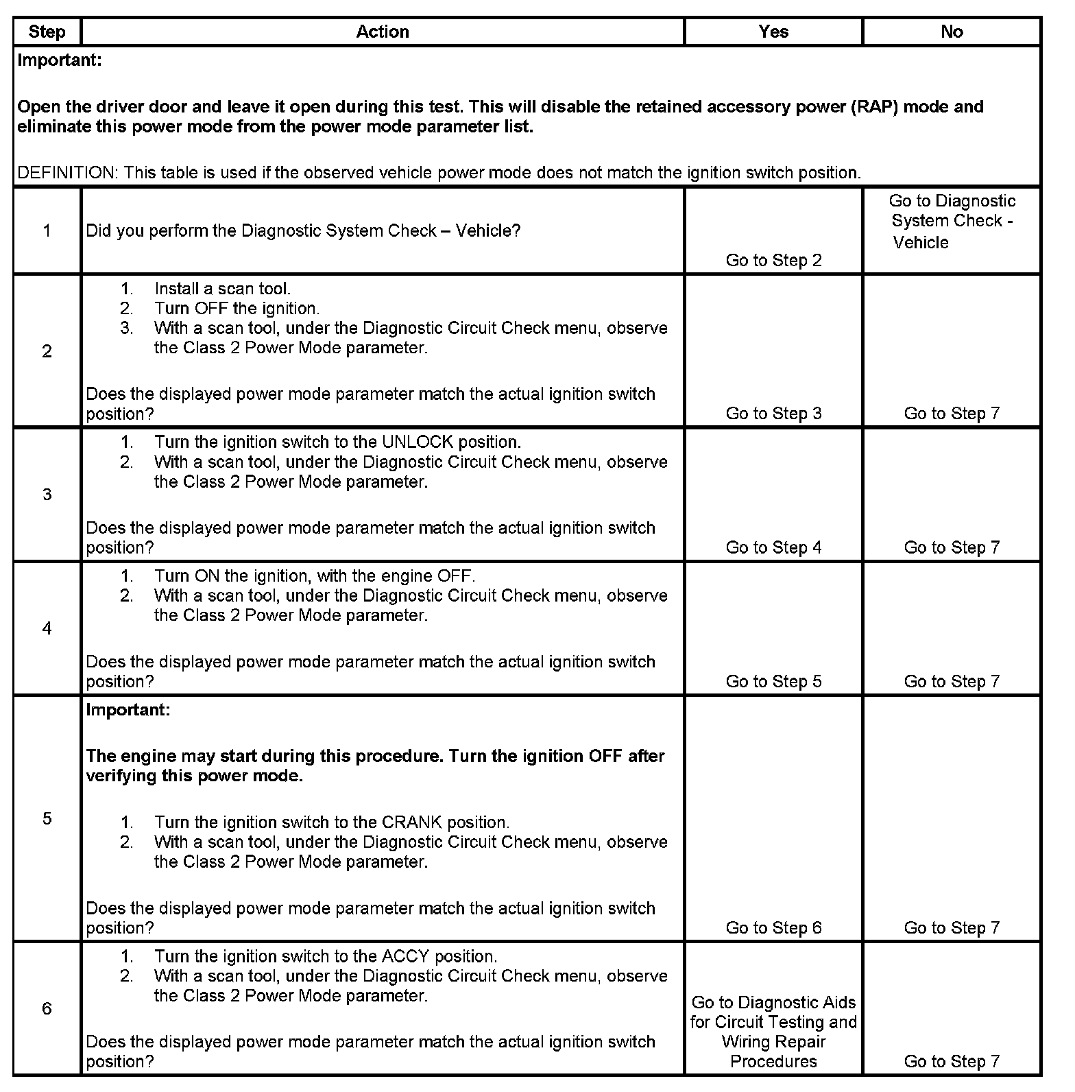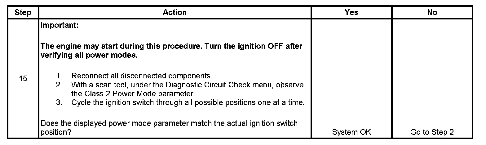 Normal vehicle class 2 communications and module operations will not begin until the system power mode has been identified. Discrete wires from the ignition switch contacts are monitored by the power mode master (PMM) module in order to determine the correct power mode. The PMM communicates the system power mode to all class 2 modules on the class 2 serial data line. Refer to Body Control System Description and Operation to identify which module is the PMM and the applicable power mode look up table.