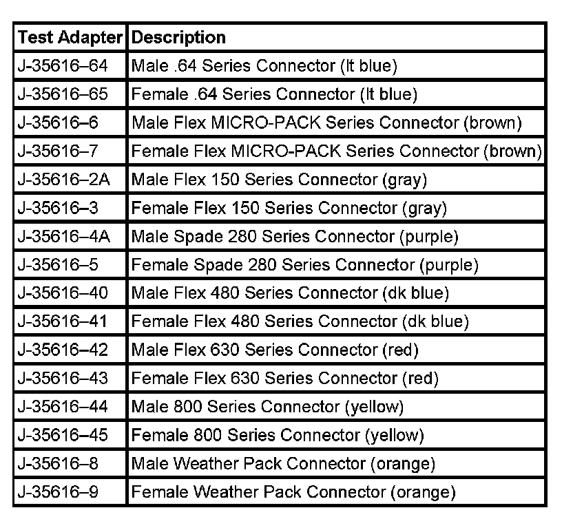 When using the J-35616 GM-Approved Terminal Test Kit, ensure the terminal test adapter choice is the correct size for the connector terminal. Do not visually choose the terminal test adapter because some connector terminal cavities may appear larger than the actual terminal in the cavity. Using a larger terminal test adapter will damage the terminal. Refer to the J-35616 GM-Approved Terminal Test Kit label on the inside of the J-35616 GM-Approved Terminal Test Kit for the correct adapter along with the connector end view for terminal size.