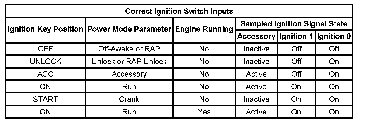 Those modules that have discrete ignition signal inputs also remain in the state dictated by the last valid BCM message received on the serial data circuits. They then check the state of their discrete ignition input to determine the current valid state. If the discrete ignition input is active, B+, the modules will fail-safe to the RUN power mode. If the discrete ignition input is not active, open or 0 voltage, the modules will fail-safe to OFF-AWAKE. In this state the modules are constantly checking for a change status message on the serial data circuits and can respond to both local inputs and serial data inputs from other modules on the vehicle.