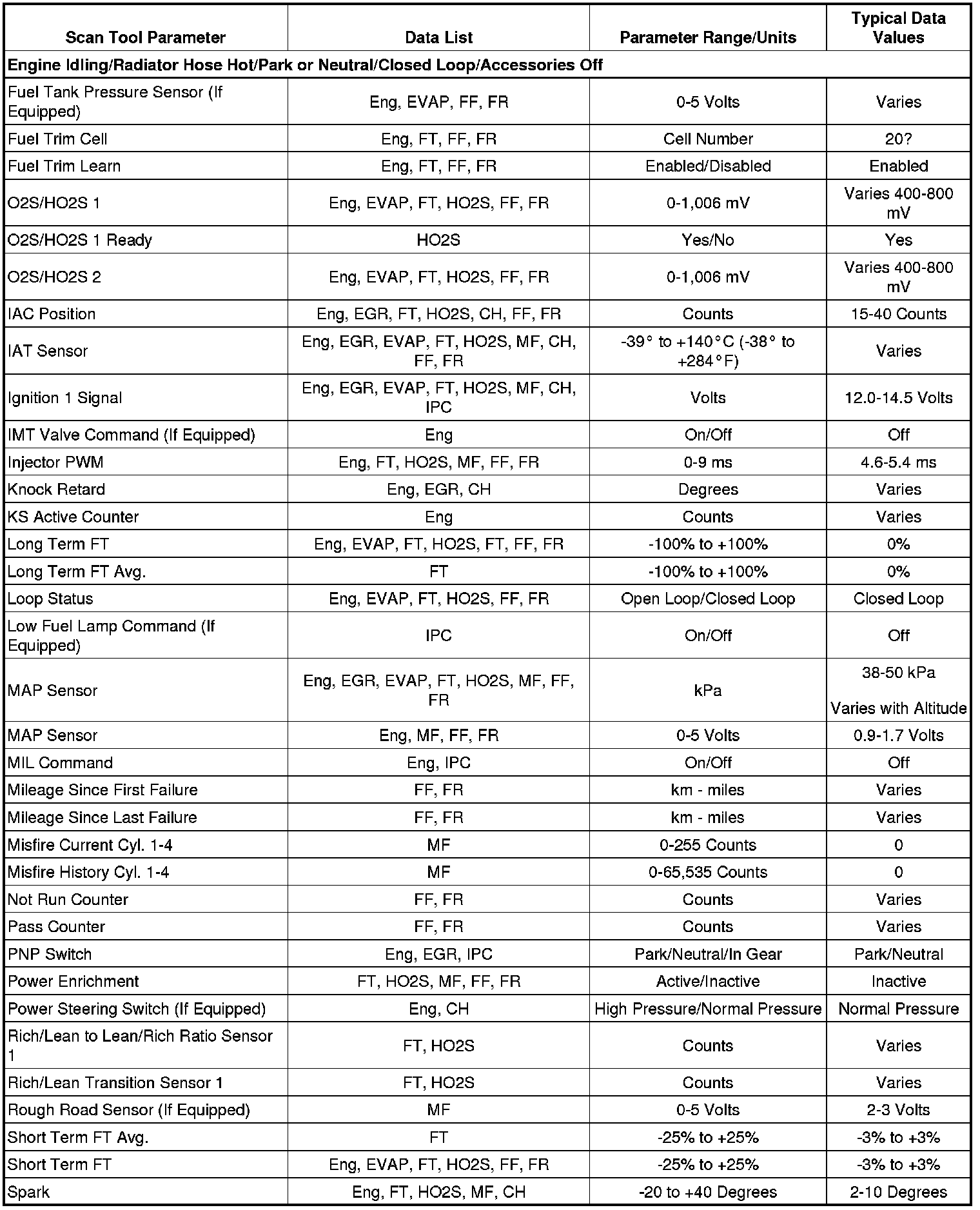The Engine Scan Tool Data List contains all engine related parameters that are available on the scan tool. The list is arranged in alphabetical order. A parameter may appear in any one of the data lists, and in some cases may appear more than once, or in more than one data list in order to group certain related parameters together.