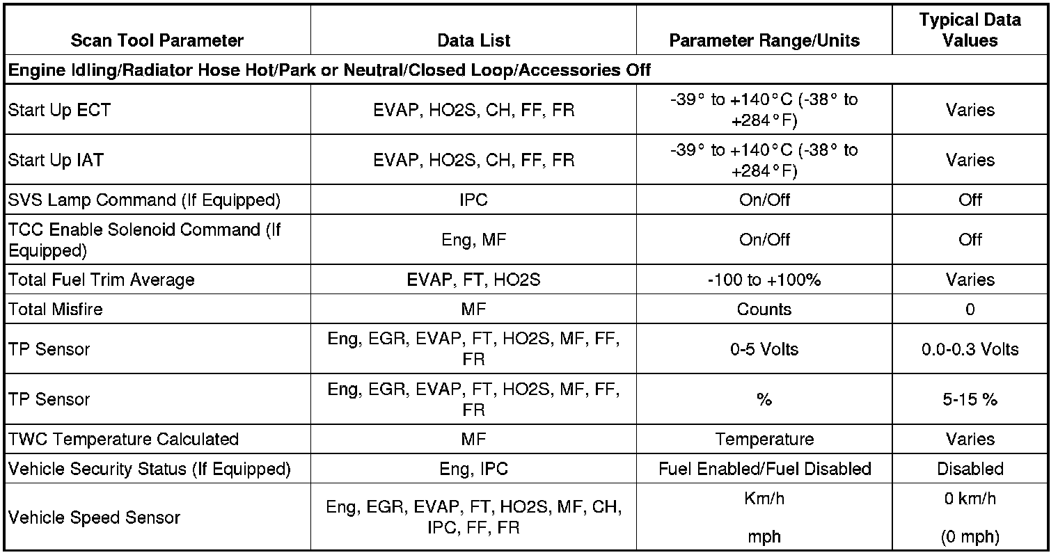Scan tool values from an engine that is operating correctly may be used for comparison with the engine you are diagnosing. The Engine Scan Tool Data List represents the values that would be seen on a normal operating engine.